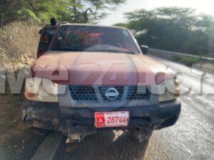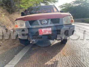 Dialuna mainta a drenta informe di un accidente den Rooi Manoonchi panort di Cayena Mall, mesora a dirigi un patruya na e sitio. Na yegada di e patruya a bin compronde cu e dama chauffeur di e pick-up Nissan Frontier bayendo nort ora di bay bira pa e subida riba e caminda muha aunke cu raspa pero toch asina mes a slip perde control bay banda robes di caminda dal riba e serito di santo. Aunke e impacto tabata fuerte afortunadamente ningun hende a resulta herida.