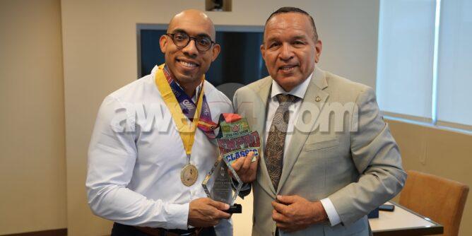 Durante e bishita ameno, Lyndonn a comparti cu Minister diDeporte su experencia den e competencia y deporte aki. Esaki sigur ta rekeri di deseo, disciplina, dedicacion y determinacion. Lyndonn ta ful enfoca den e deporte aki. Lyndonn ta practicando diariamente y ta preparando pa su siguiente competencia cu ta tuma luga na Colombia. Den nomber di Gobierno di Aruba, Minister Endy Croes a sorprende Lyndonn cu un bunita reconocemento pa su excelente prestacion, logro y pa pone Aruba su nomber briyaden exterior.
