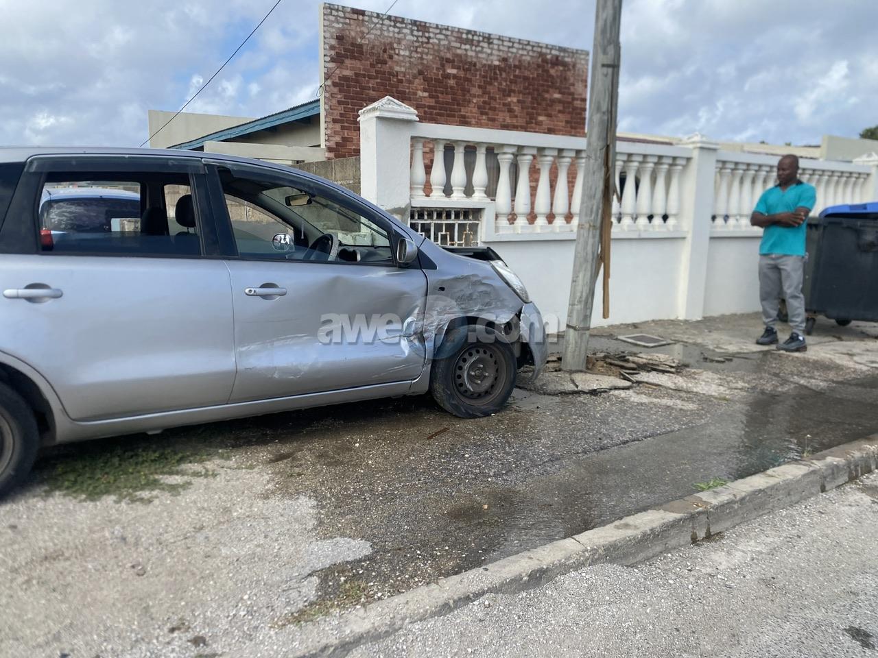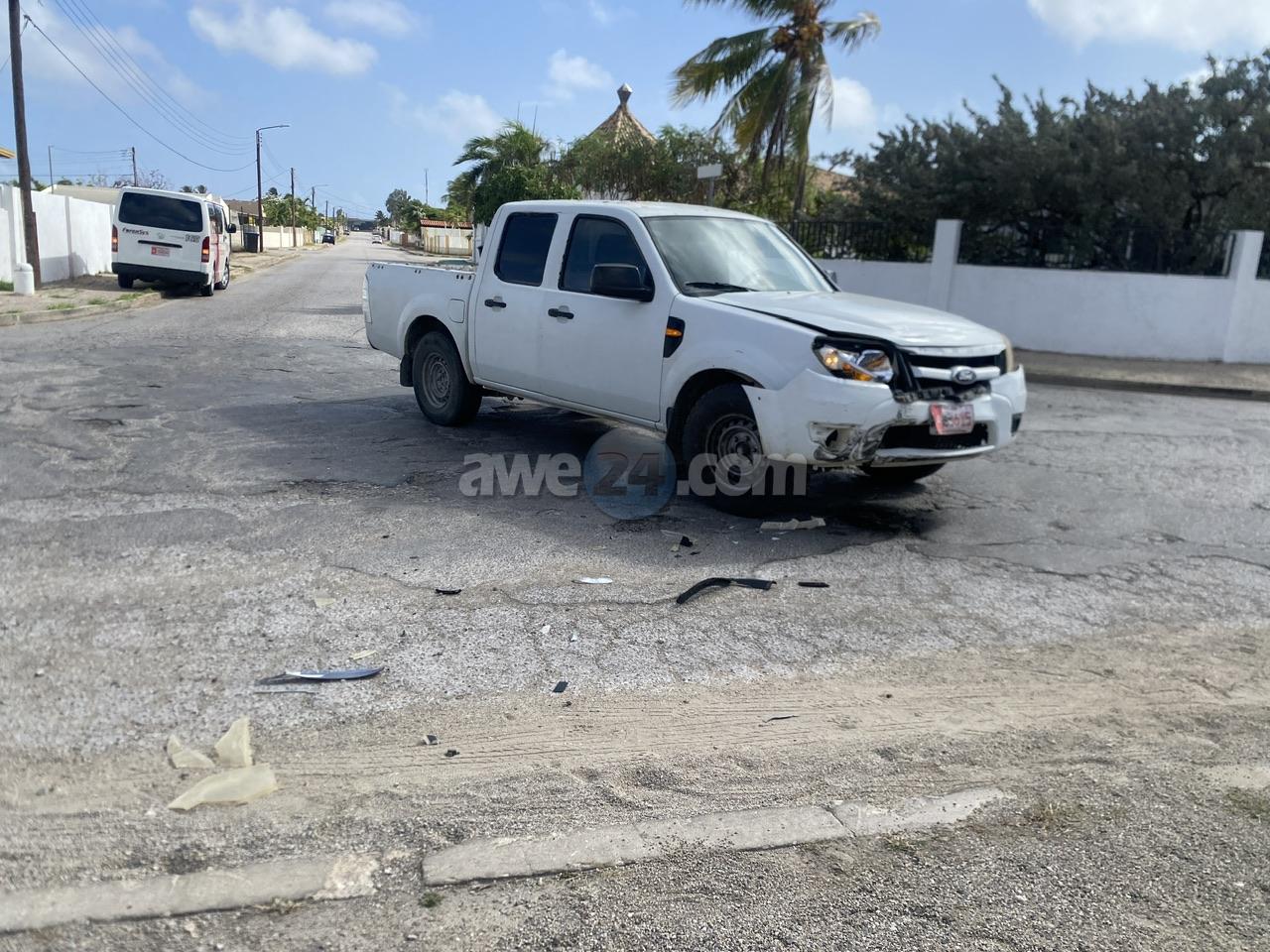 Diamars mainta a drenta informe di un accidente na e crusada T na Caya Frere Alexius y Caya Frere Arnold, mesora a dirigi un patruya na e sitio. Na yegada di e patruya a bin compronde cu aki ta trata di un accidente unda cu e chauffeur di e Pick-up Ford Ranger biniendo for di nort den Caya Frere Alexius no a duna preferencia na e Nissan Note bayendo pabao den Caya Frere Arnold. Debi na e impacto e Nissan Note a bay subi acera banda pazuid y a bay dal riba un meter di awa kibra esaki y tambe dal riba un palo di lus y kraak te casi kibra e. Na e accidente aki un chauffeur no tin rijbewijs y un di e autonan no tin su papelnan na ordo y polis a confisca e vehiculo aki.