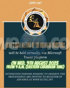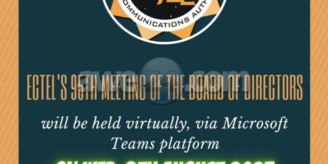 Castries – Saint Lucia – 7th August 2023 – The Eastern Caribbean Telecommunications Authority (ECTEL) will be staging its 95th Board of Directors Meeting virtually, via Microsoft Teams platform, on Wednesday, 9th August 2023 from 9:00 a.m. Interested persons may choose to observe the proceedings of the meeting virtually by registering athttps://www.ectel.int/notice-95th-meeting-of-the-ectel-board-of-directors/.