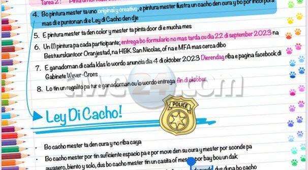 ORANJESTAD: E aña aki ta di cinco aña consecutivo cu Gobierno di Aruba ta organisa un concurso caminda cu a traves di nan pintura muchanan ta expresa y siña tocante Aruba Ley di Cacho. E concurso aki a wordo carga e prome tres (3) añanan door di nos Minister-President Evelyn Wever-Croes tambe door di colega Minister di Husticia y Asunto Social Rocco Tjon. E aña aki e ta wordo carga door di Minister di Enseñansa Endy Croes cu a dicidi di sigui e liña di e campaña cu Cuerpo Policial a inicia: Cacho den Cura, ta Ley e Ta. Pa es motibo, e titulo di e Concurso di Pintamento 2023 ta: Cacho den Cura.