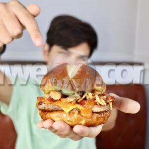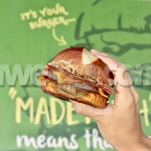 E protagonista di e Pretzel Bacon, sin duda algun, ta e pan traha segun receta original, pero inspira pa e pan artesanal cu mansa di pretzel. Den dje bo ta haya e delicioso burger patty di 100% carni cu keshi tipo Muenster, Applewood smoked bacon, smokyhoney mustard, warm beer cheese sauce, crispy fried onions y pickles. Bo por haya e burger su so of den combo hunto cu batata y refresco y e ta obtenibel solamente pa un tempo limita.