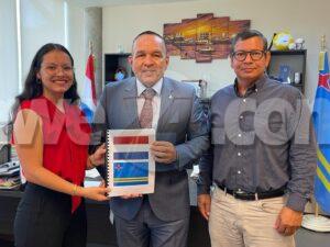 ORANJESTAD: Recientemente, Minister Endy Croes a reunicu Sra. Liraysa Ponson y Sr. Gregorio Tromp. Sra. Ponsontabata un studiante na Universidad di Aruba, Faculty of Hospitality and Tourism Management Studies. Den e etapafinal di su estudio el a haci un investigacion pa su tesis. E titulo di e tesis ta“Factors related with the choice to moveback to Aruba once graduated”. Manera ta conoci, Aruba tabrinda e studiantenan e oportunidad unico pa continua cu nan estudio avansa den exterior na, entre otro, Hulanda. E deseo tapa una bes e studiantenan termina nan estudio regresa Aruba bek cu nan diploma, conocemento y experencia pa asinacontribui na progreso y desaroyo di nos pais.Lamentablemente, tin studiante no ta finalisa nan estudio of no ta regresa Aruba. Esaki ta significa cu Aruba no tabeneficia di e conocemento y experticio di e studiantenan aki.
