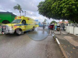 Diadomingo mainta a drenta informe di un accidente na e crusada Socotorolaan cu Emmastraat, mesora a dirigi tanto polis como ambulans na e sitio. Na yegada di e patruya a bin compronde cu aki ta trata di un accidente unda cu un Kia Cerato bayendo pabao den Socotorolaan no a para pa duna preferencia na un Jac s.u.v. bayendo zuid den Emmastraat e impacto tabata asina fuerte cu e Jac a bira 180 grado y cu e wiel di patras a dal na e acera. Debi na e fuerte impacto net na banda di chauffeur e dama a resulta herida. Na yegada di e ambulans nan a atende e victima y a transporte pa hospital.