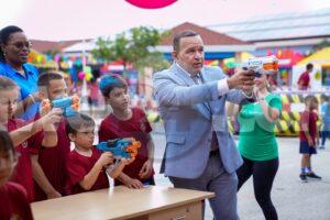 ORANJESTAD: Dia 20 di november ultimo, en conexion cu Dia Internacional di Derecho di Mucha y 15 aña di existencia di Scol Primario Kudawecha, Minister di Enseñansa Endy Croes a bishita nan Feria di Diversion. Na yegada cabesante di e scol Sra. Xiomara Berkel a ricibi mandatario di enseñansa y a dun’e un recorido den e Feria di Diversion. Tambe, Minister Endy Croes tabatin e oportunidad pa participa den algun wega. Presente na e mainta special aki, tabata Sra. Morela Dirks y Sra. Marylou Maduro di DPS. Manera ta conoci, Scol Primario Kudawecha ta resorta bou di Dienst Publieke Scholen (DPS) y ta conta cu alrededor di 400 alumno. E scol a organisa un mainta ameno unda cu e alumnonan por a disfruta di diferente wega popular y actividad.  Sigur e alumonan a gosa di e mainta dedica na nan, tabata reina un ambiente y alegria. Cabesante di e scol Sra. Xiomara Berkel a expresa cu tabata un mainta hopi special pa e scol unda cu nan a celebra Dia Internacional di Derecho di Mucha y 15 aniversario cu e scol a cumpli na luna di augustus ultimo. Pa conclui, Minister Endy Croes ta gradici pa e invitacion, alabes ta felicita docente- y alumnonan cu diescinco (15) aniversario di e scol. Mandatario di Enseñansa ta gradici e cabesante Sra. Berkel y e docentenan cu durante 15 aña largo a educa nos yiunan.