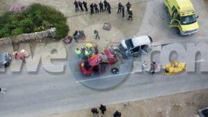 Diamars mainta a drenta informe di un accidente cu hende herida y pega den e auto na San Miguel. Mesora a dirigi tanto polis, ambulans y brandweer na e sitio. Na yegada di e patruya a bin compronde cu chauffeur di un auto Maazda cora pa un of otro motibo lo a bai otro banda di e caminda y a dal den un auto shinishi. E impacto tabata fuerte y a causa hopi daño material. Un persona lo ta pega den auto. Na yegada di e ambulans nan a atende cu e victimanan. Na yegada di e brandweer nan mesora a traha pa saca e victima cu su pia lo ta pega bao di e dashboard.