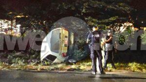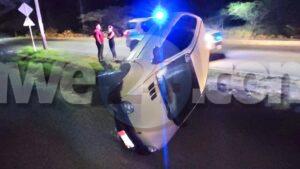 Diadomingo madruga a drenta informe di un accidente pabao di e rotonde Tanki Flip, mesora a dirigi un patruya na e sitio. Na yegada di e patruya a bin encontra cu un auto hinca den e greppel y a bin compronde cu pa un descuido di e chauffeur ela baha caminda y bay cay den e greppel. Den e auto tabata tin 3 persona y nan tur a sali ileso.