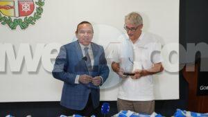 Minister Endy Croes a expresa en conexion cu e di dies (10) container cu a yega Aruba, ta un momento hopi special pa reconoce, celebra y gradici esnan cu ta haci esaki posibel. Den nomber di Gobierno di Aruba, Minister Endy Croes a haci entrega di e reconocemento di aprecio y gratitud na ambos fundacion pa nan contribucion cu e materialnan deportivo sea ta pa scol y/of centro deportivo rond di Aruba. Tambe, mandatario di Deporte a gradici tur stakeholder y boluntario pa haci e proyecto aki posibel. Minister Endy Croes a enfatisa cu esaki ta un ehempel di trabou di ekipo entre e fundacion-, comerciante- y boluntarionan y Gobierno di Aruba pa ekipa gymzaal di e scolnan cu materialnan deportivo, pa asina e alumnonan por haya les di gymnatiek (gymles) na un forma mas eficiente.