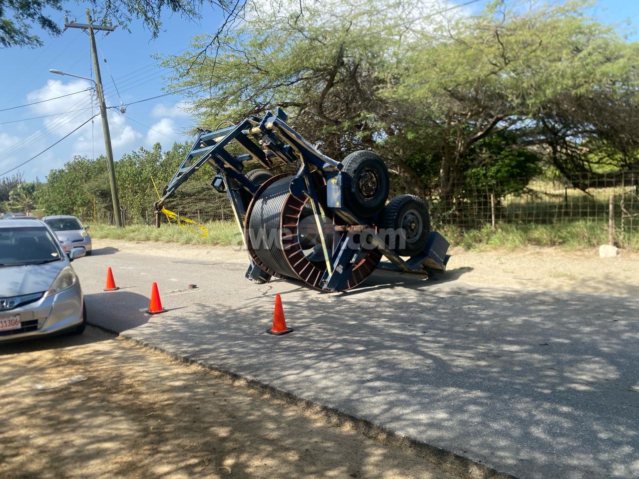 Diahuebs mainta a drenta informe di un incidente na Catiri. Aki ta trata di un incidente unda un truck cu tabata lastra trailer cu un katrol riba di dje lo a bai hala pa un auto y e caminda smal a hasi cu e trailer a bai dal den un barranca banda di caminda. Esaki a pone cu e trailer cu katrol kita di e truck y bolter. E katrol cu waya tabata destina pa bai Kudawecha pa asina ELMAR por instala. Afortunadamente ningun persona a resulta herida. E auto cu tabata pasando a logra net pasa y no a ricibi ningun daño.