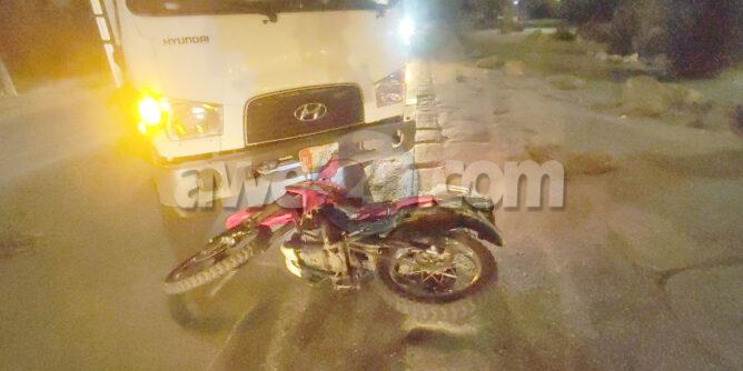 Diabierna anochi a drenta informe di un accidente dilanti di Riu Palace, mesora a dirigi un patruya na e sitio. Na yegada di e patruya a bin compronde cu aki ta trata di un accidente unda un truck a bay bira pero no a mira e brommer di direccion contrario y pa evita e fuerte impacto e motociclista a bula for di s brommer cual a bay pega bao di e truck. E motociclista a djies haya un golpi y algun rasca pero nada di gravedad y no tabata desea atencion medico. E motociclista kiermeen e no tin mucho tempo cu ela cumpra e brommer y ya e tabata den tramite pa bende pa cumpra un auto.
