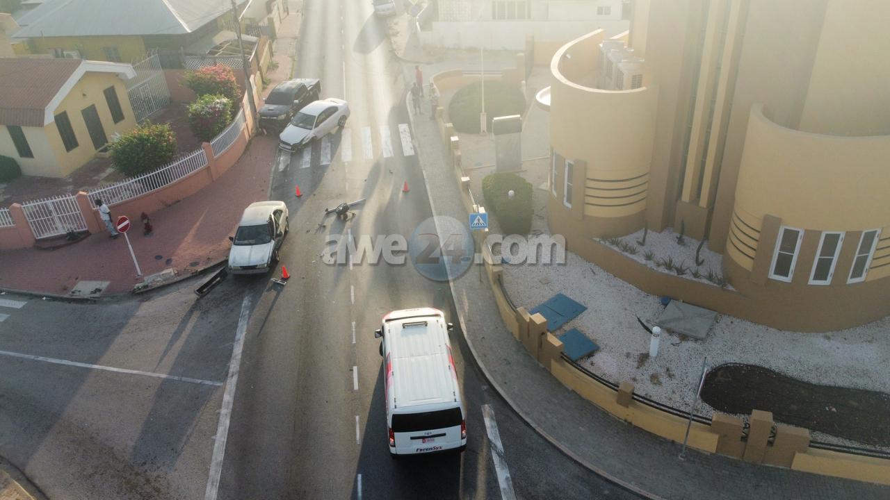 Diahuebs mainta un polisnan di Sanicolas durante patruya a bin top un accidente cu basta daño material y 3 auto envolvi, mesora nan a para baha y check kiko lo pasa y si tin hende herida. A bin resulta cu e chauffeur di un Subaru Legacy bayendo direccion pariba a pega soño tras d stuur y a bay dal riba un Nissan Sentra y despues a bay dal riba un Toyota Pick-up. Afortunadamente ningun hende a resulta herida pero ningun di e 3 autonan por a sigi core riba su propio forsa. Mirando cu e Nissan Sentra no tabata tin ningun documento na ordo polis a confisca esaki den beslag.