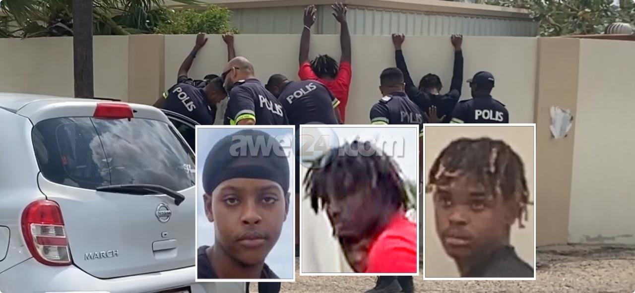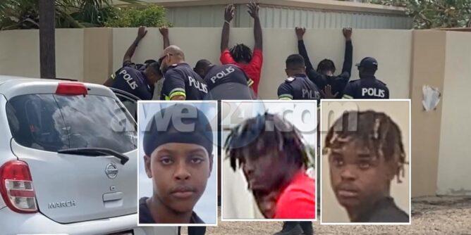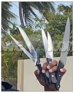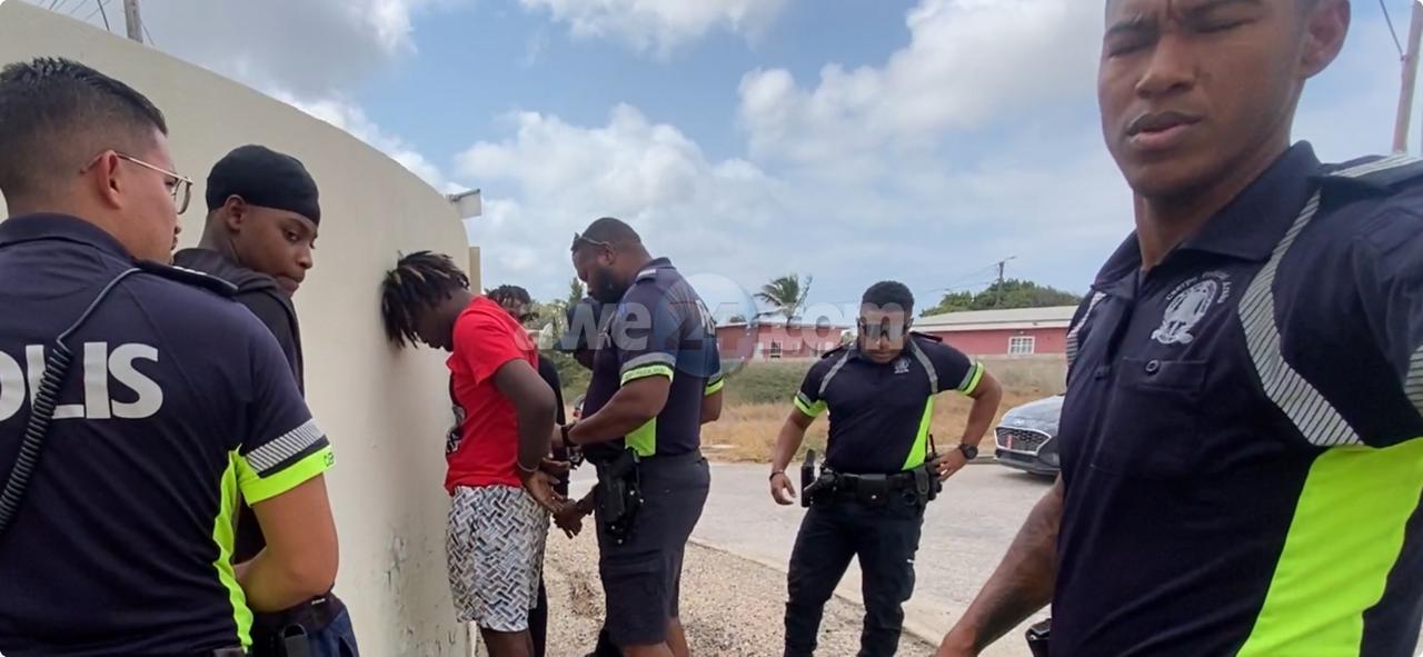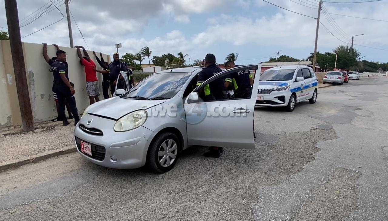 Despues di a tuma deeclaracion di e hoben menasa polis a sali en busca di e Nissan March cu e gang di Haïti, mesora a para nan y bahanan for di e auto. Buscando e armanan polis a bin encontra no menos cu 8 cuchiu. Polis a confisca esakinan y a detene nan. Ta trata aki di 3 hoben y a hiba nan na warda di polis. Mientras a laga e auto para un banda riba e acera.