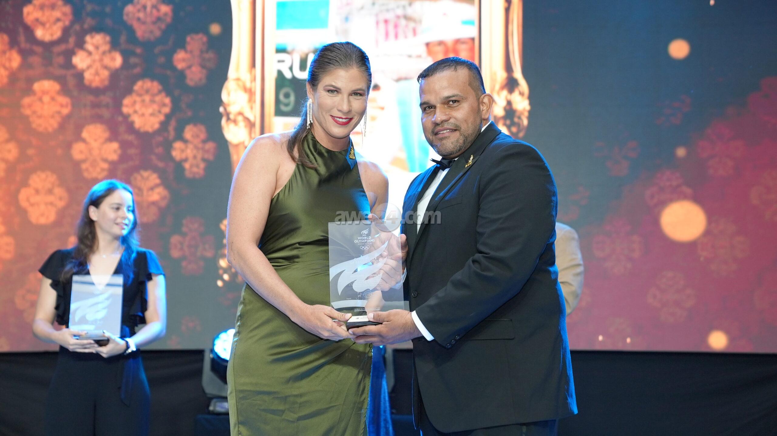 ORANJESTAD: Durante Premio Excelencia den Deporte 2023, a reconoce cuater (4) atleta olimpico pa nan gran trayectorio y promove e balornan olimpico. Roshendra Vrolijk a ricibi un certificado y pin di Olympians for Life (OLY) for di man di presidente di Asociacion Arubano di Atletanan Olimpico, Sr. Isnardo Faro. Roshendra a participa cu su 15 aña di edad y te cu awo e ta e atleta di mas hoben cu a yega di participa pa Aruba na e Weganan Olimpico, den e deporte di landamento den e evento di 50 meter “freestyle” na e Weganan Olimpico na Sydney, Australia na aña 2000 y 4 aña despues na e Weganan Olimpico na Athenas, Grecia. Fuera di esaki, Roshendra a participa na aña 2003 den FINA World Championships na Barcelona, Spaña; na aña 2003 den Central American and Caribbean Swimming Federation (CCCAN) na Mexico y na Weganan Panamericano na Santo Domingo; na aña 2002 na ODESUR na Belem, Brasi; na aña 2002 CISC na Corsou y na aña 2001 na CCCAN na Santo Domingo. Un di e caracteristacanan di Roshendra ta su determinacion, cual a hib’e pa tin un trayectoria exitoso. Minister di Enseñansa y Deporte Endy Croes ta felicita Roshendra Vrolijk cu su reconocemento OLY y ta gradicie pa contribui den e desaroyo di deporte di Aruba.