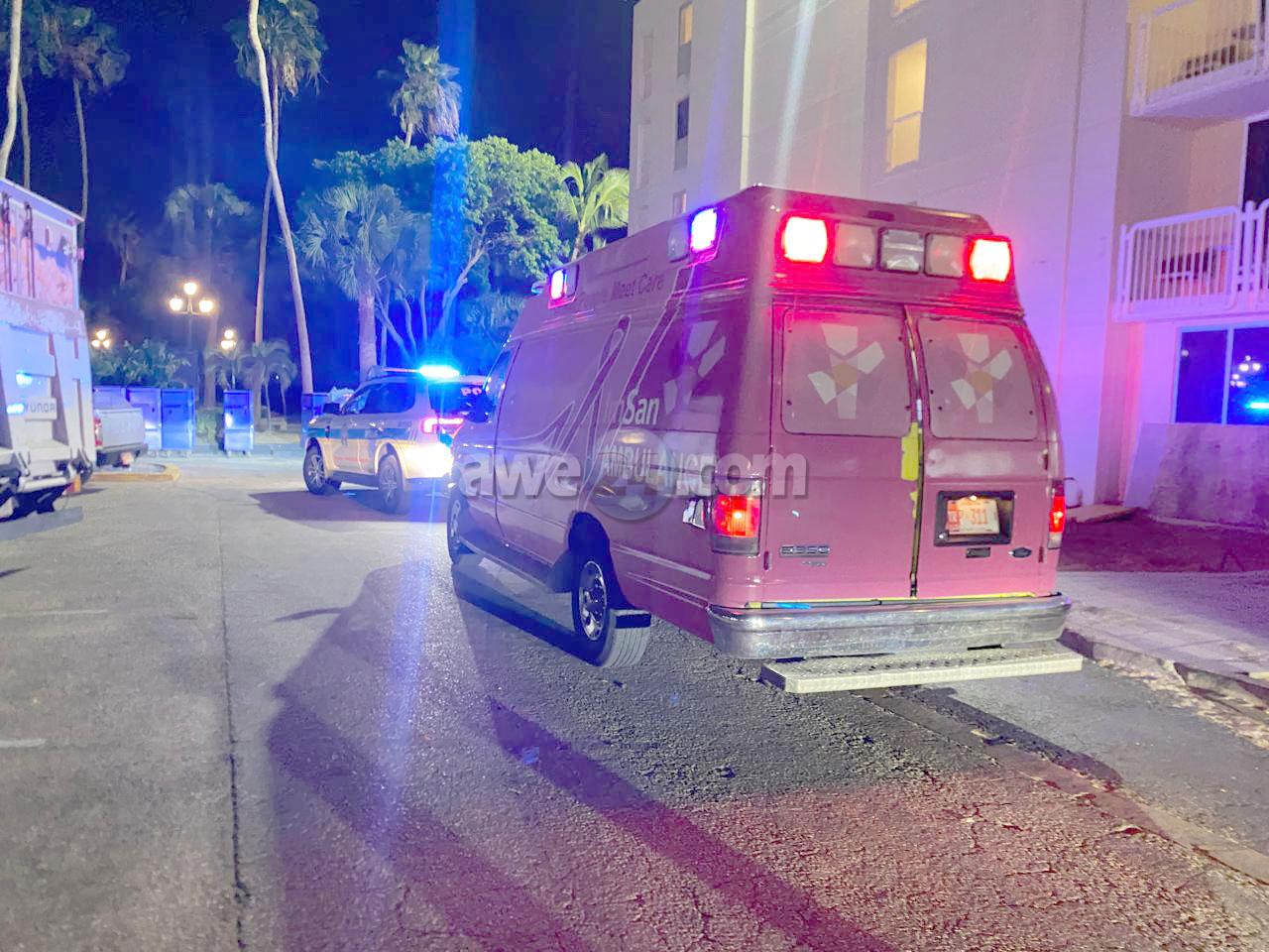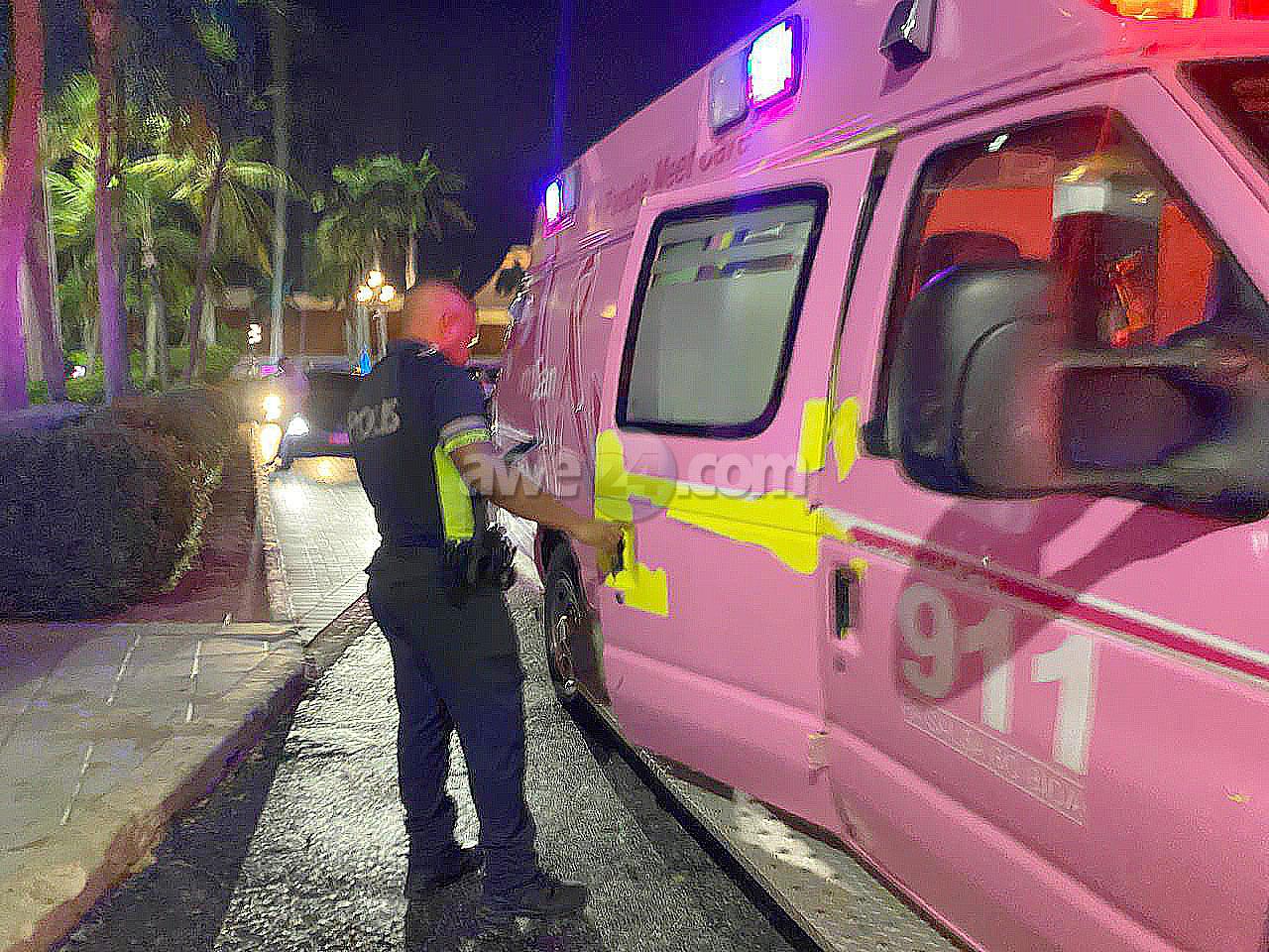 Diasabra anochi a drenta informe di un hende herida den parking lot na un hotel den Oranjestad. Mesora a dirigi un patruya na e sitio. Na yegada di e patruya a bin compronde cu 2 of 3 hoben lo a ataka un otro y di leu lo a purba tir’e cu un scopet di kelki. E hoben a resulta herida. A pidi presencia di ambulans y e team forensyco pa asina colecta mas informacion di e susedido. Na yegada di e ambulans nan a atende e victima y a transporte Polis tin e caso bao investigacion. Aki lo ta trata di un tiro di scopet di kelki.