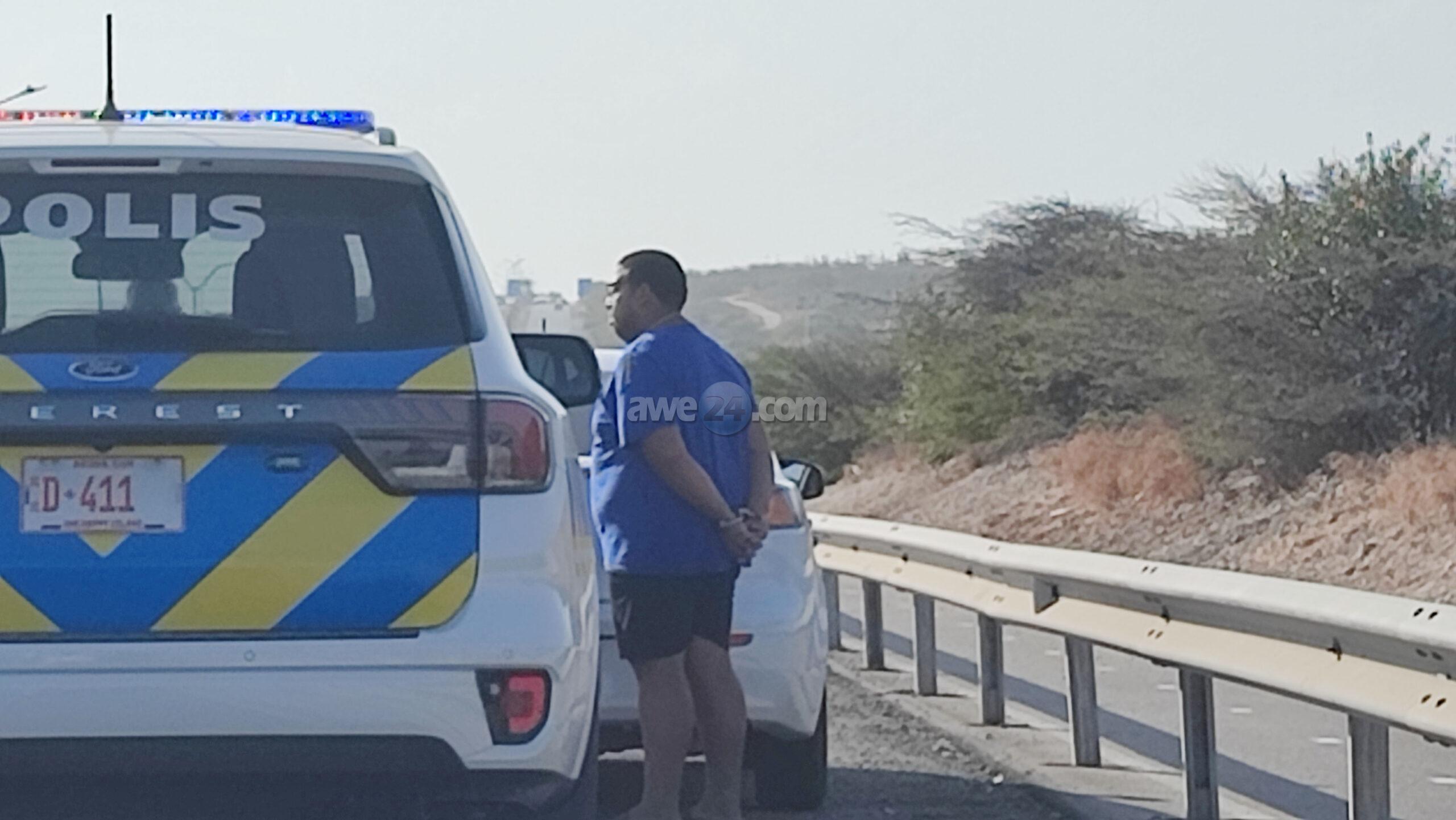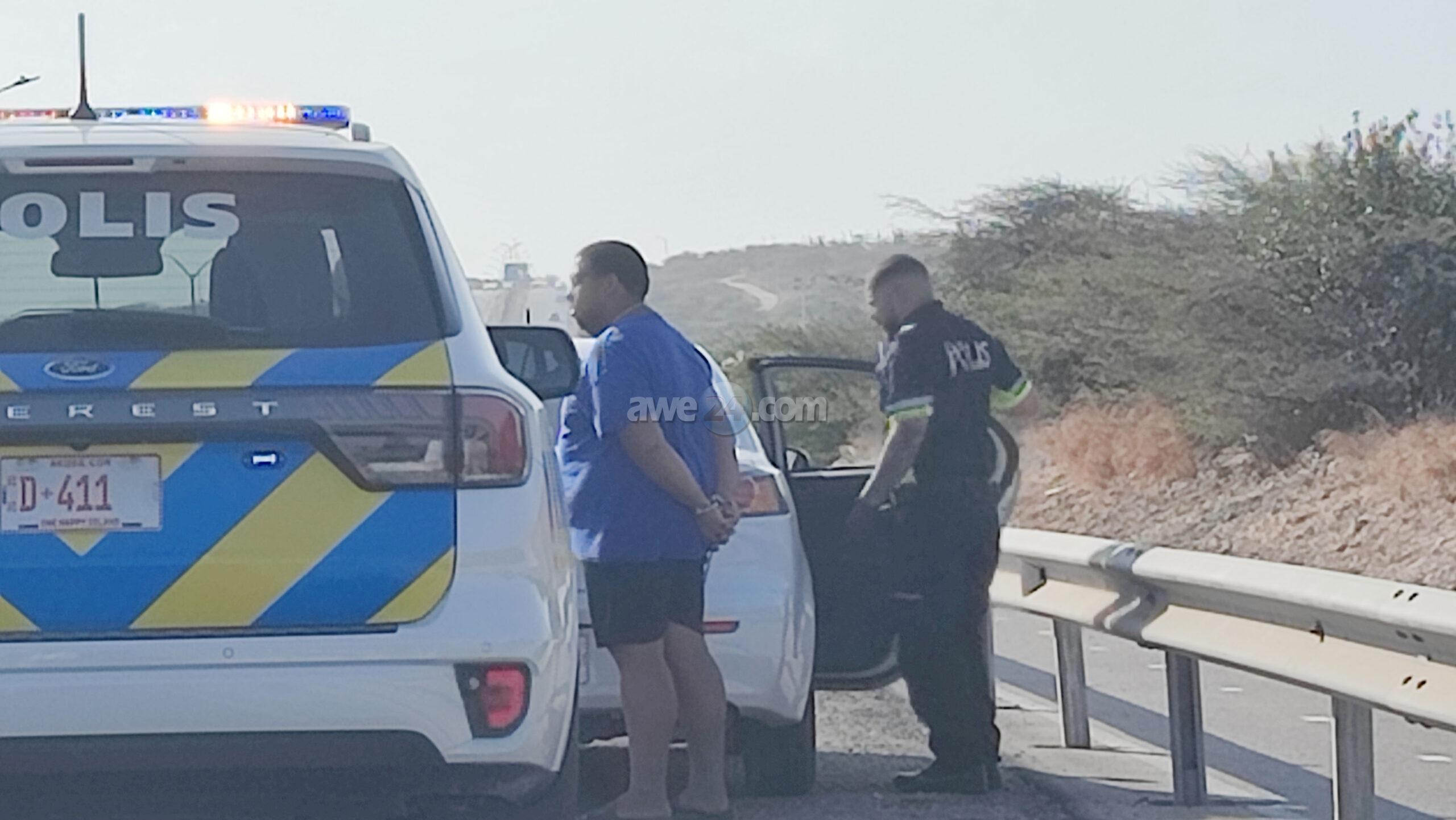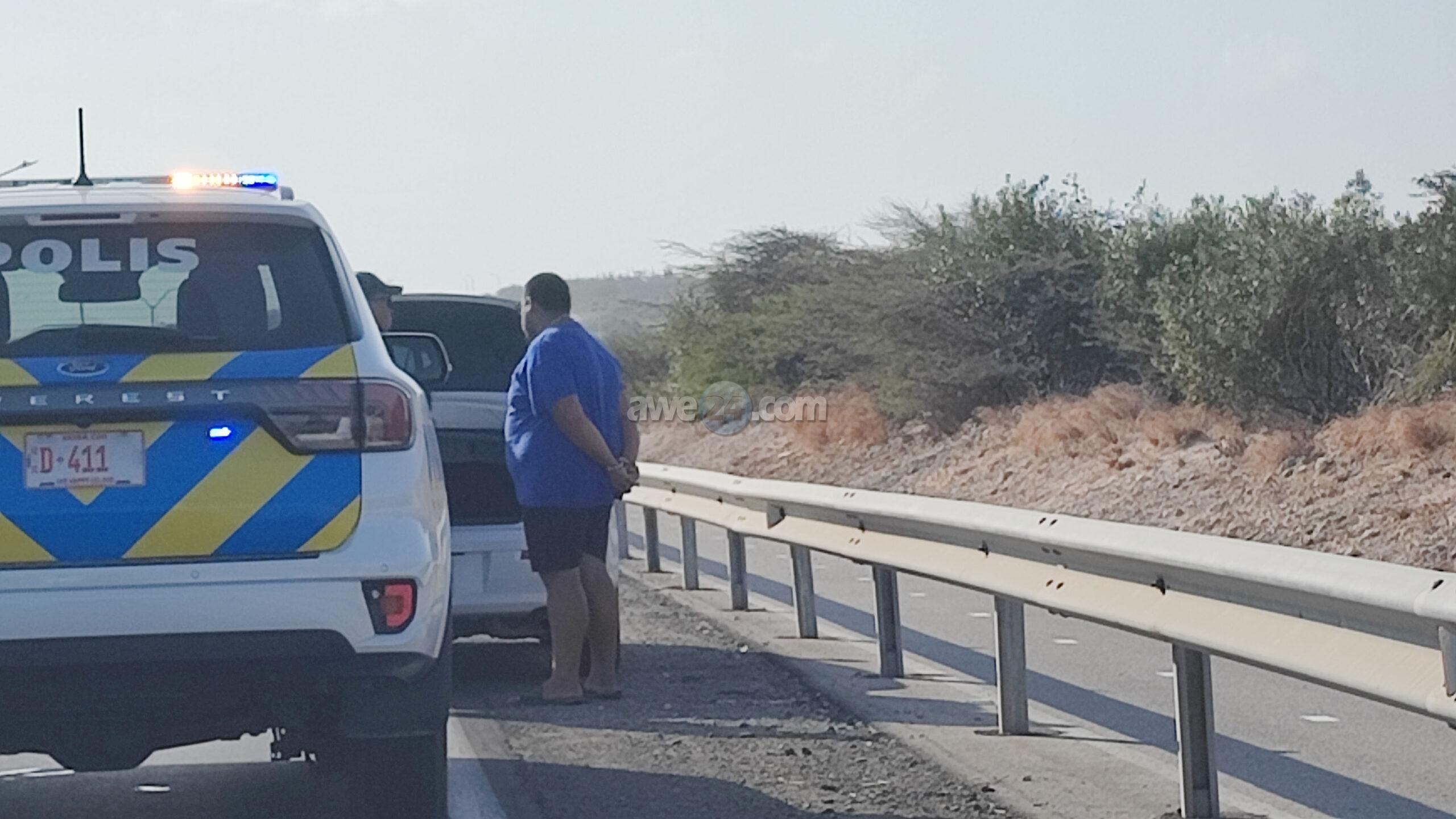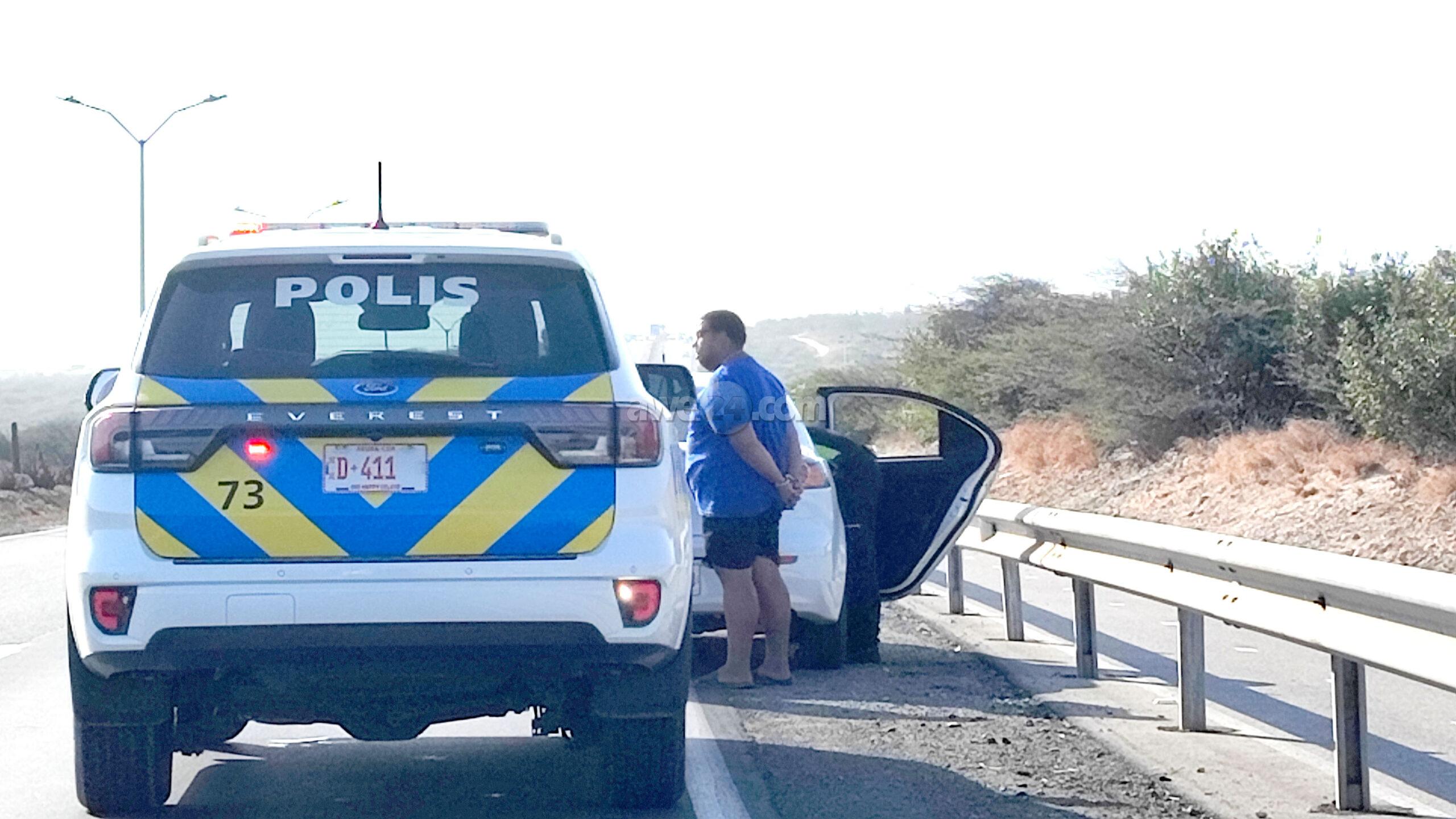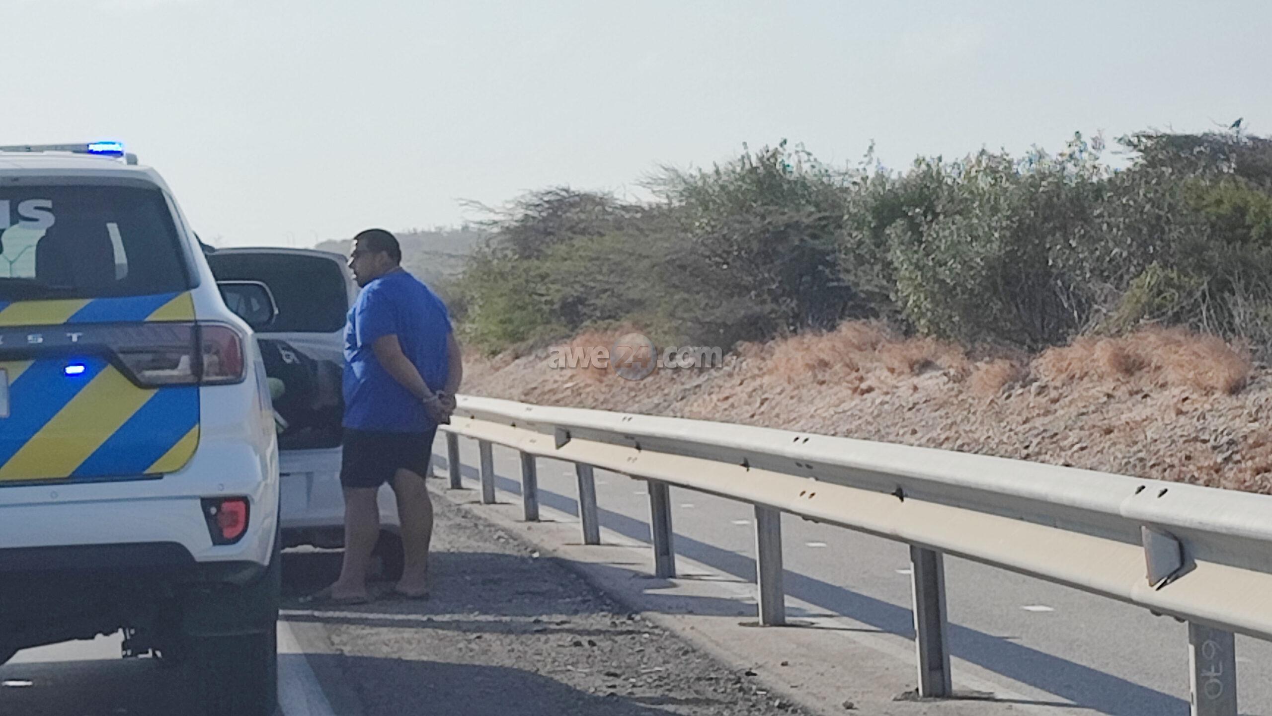Diasabra atardi polis tabata en busca cu un Mitsubishi Lancer unda cu e homber tabata maltrata y choca e muher, polis a nota un otro mitsubishi Lance coriendo cu velocidad halto na altura di Pos Chikito y a bay su tras y a logra pare poco mas pabao di rotonde Balashi unda eynan a haya holor fuerte di marihuana y ora a listra den e auto a haya pakinan di droga. Eynan a detene y a confisca tur e droga.