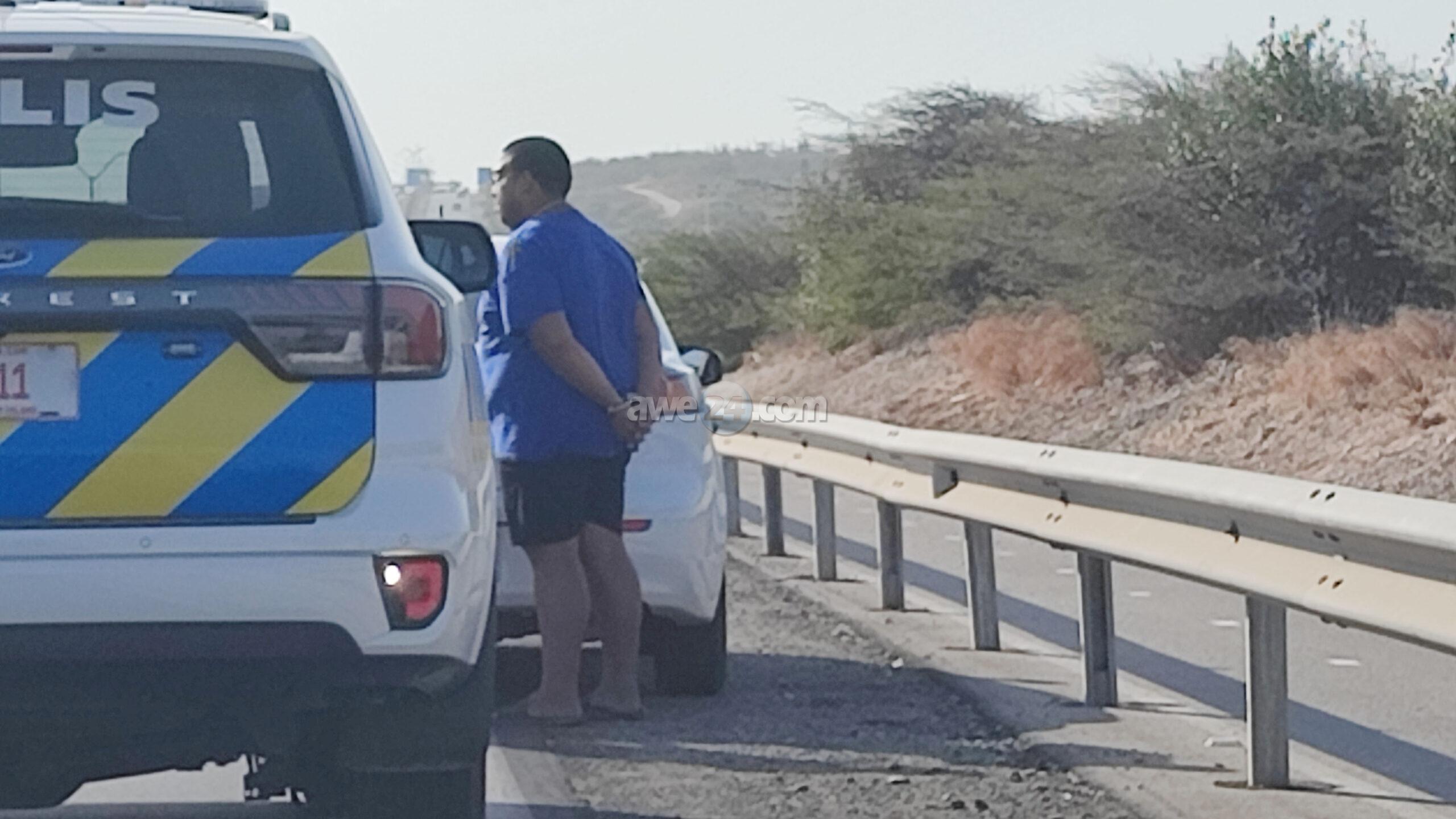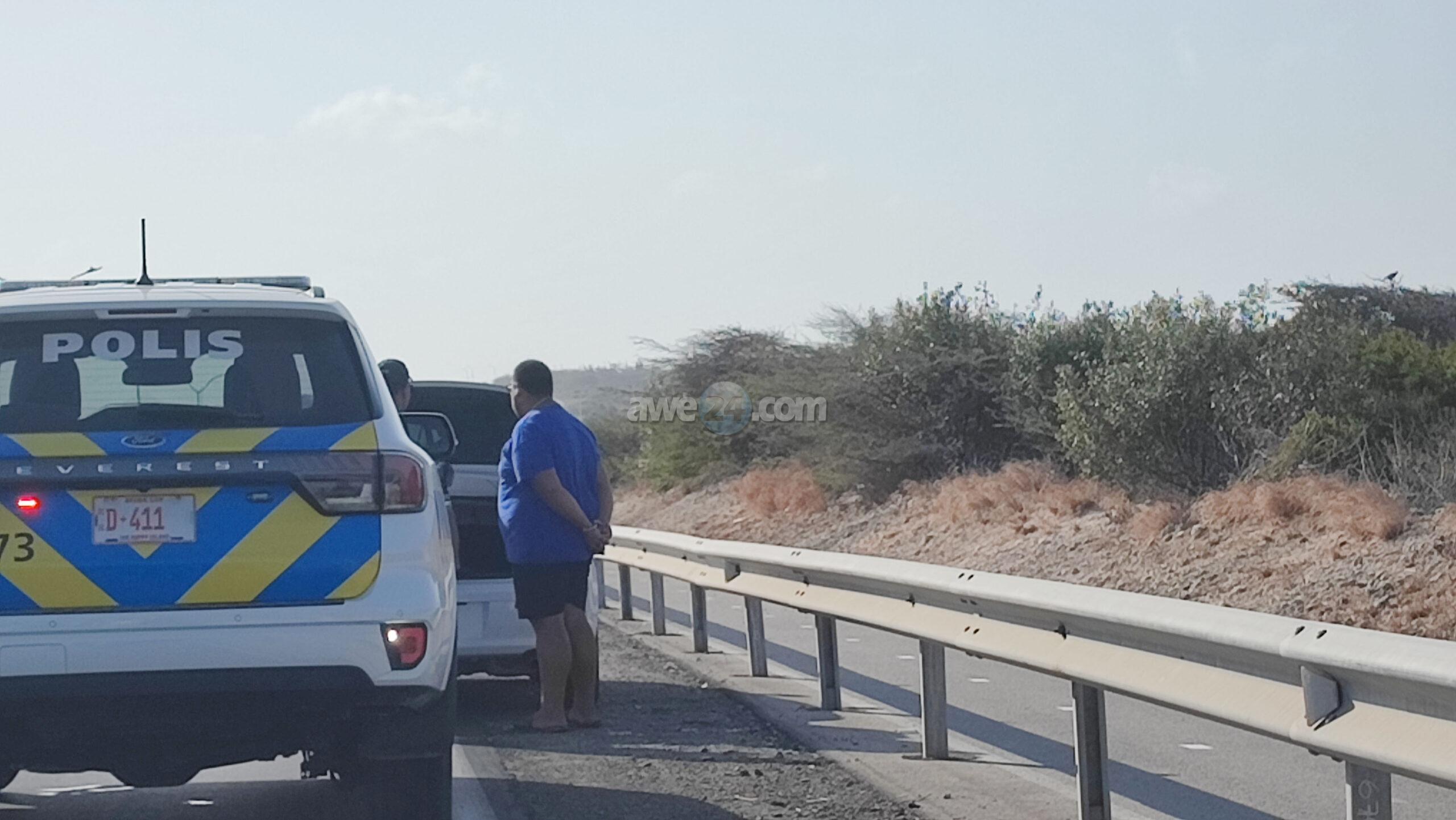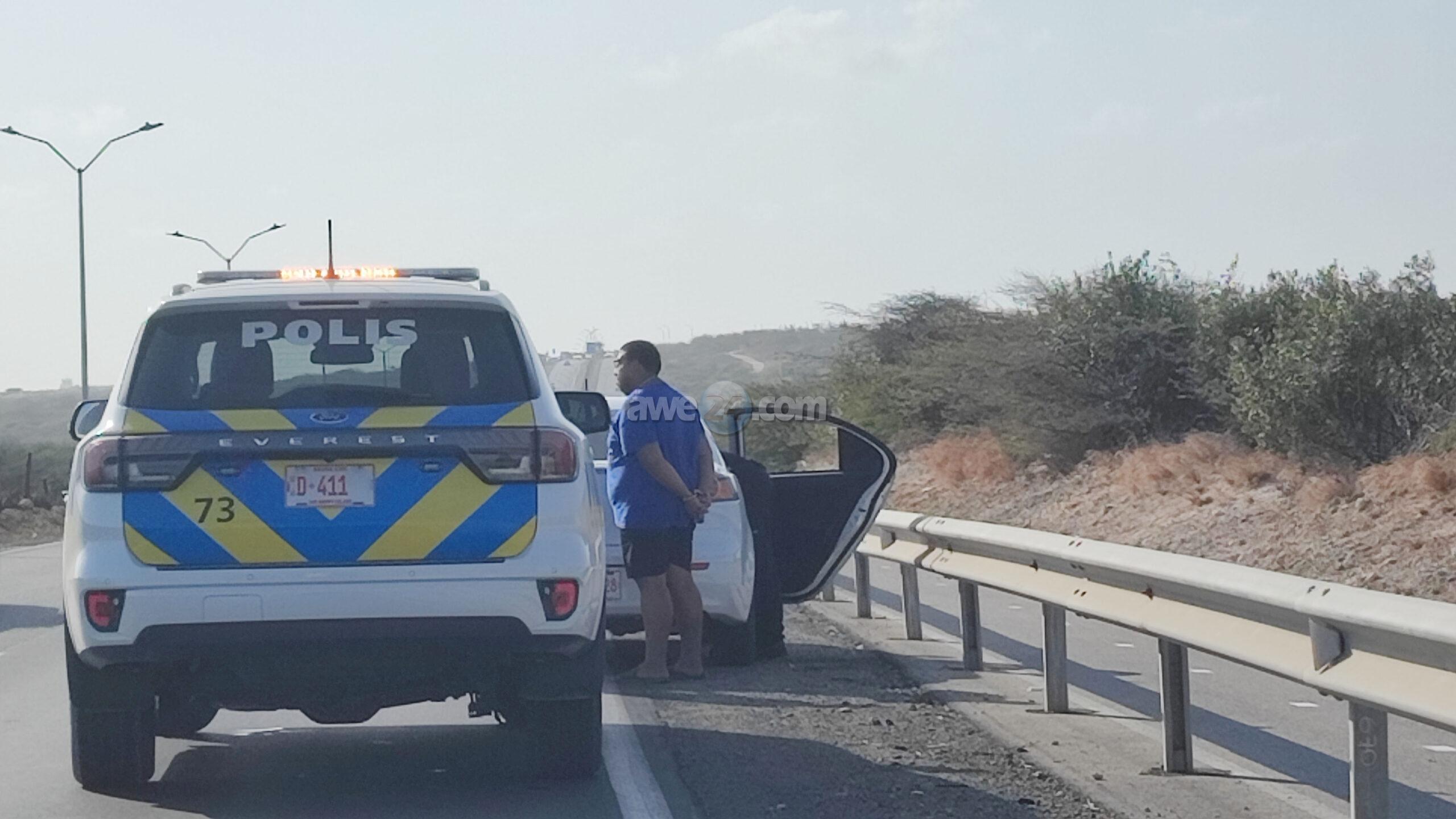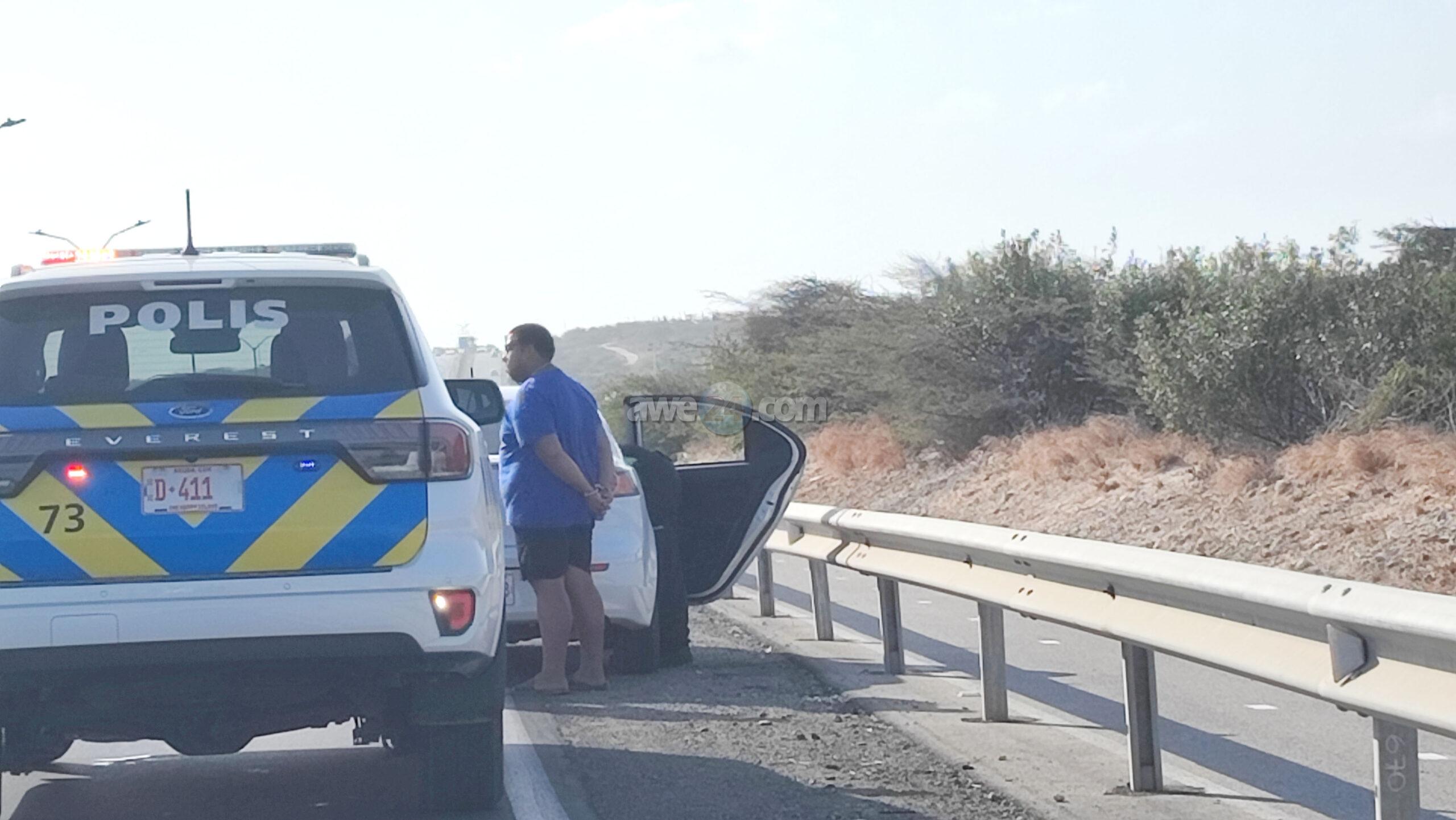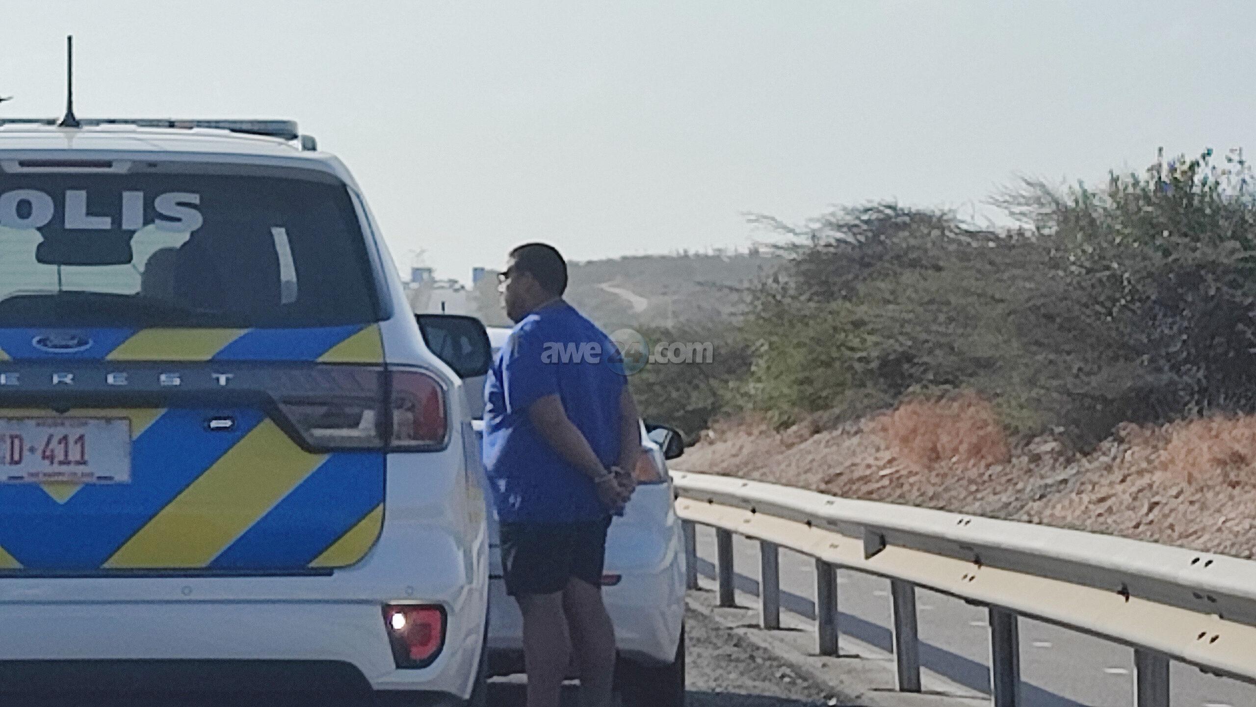 Diasabra atardi polis tabata en busca cu un Mitsubishi Lancer unda cu e homber tabata maltrata y choca e muher, polis a nota un otro mitsubishi Lance coriendo cu velocidad halto na altura di Pos Chikito y a bay su tras y a logra pare poco mas pabao di rotonde Balashi unda eynan a haya holor fuerte di marihuana y ora a listra den e auto a haya pakinan di droga. Eynan a detene y a confisca tur e droga.
