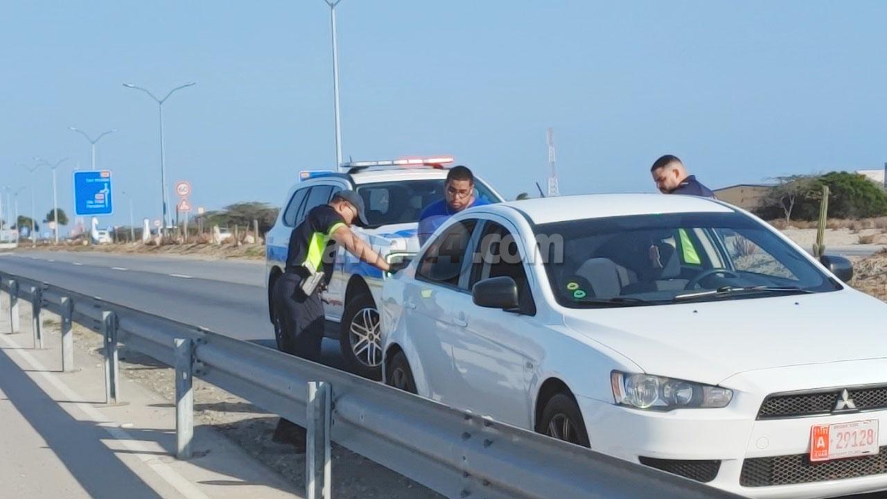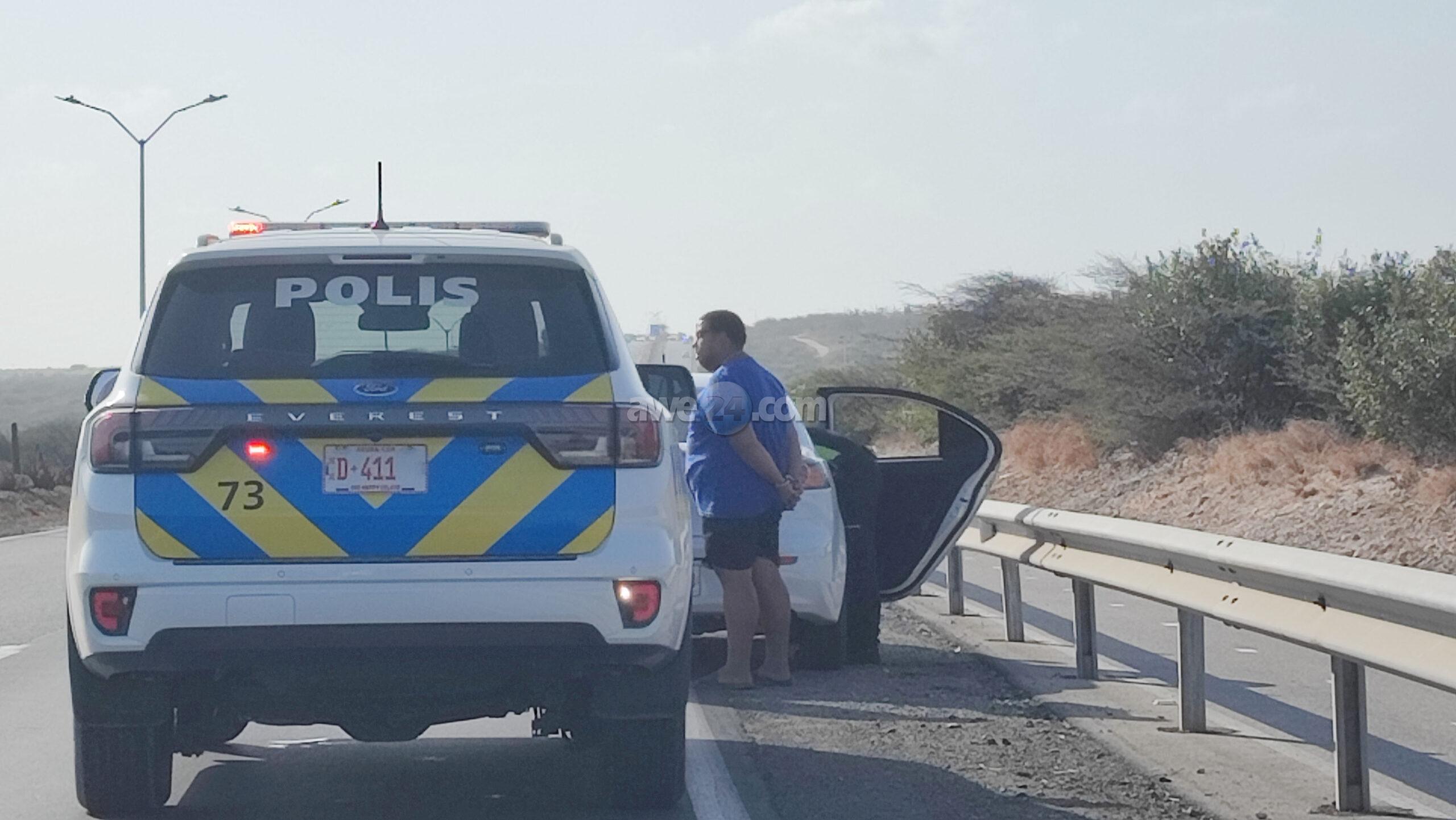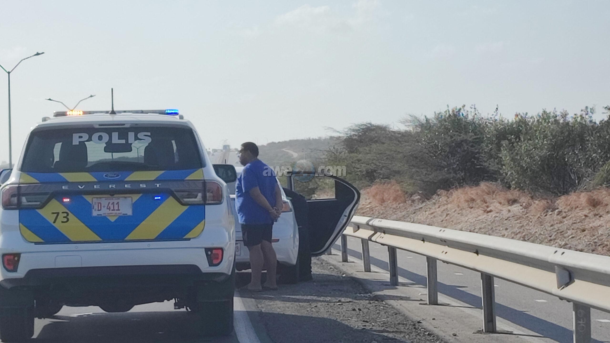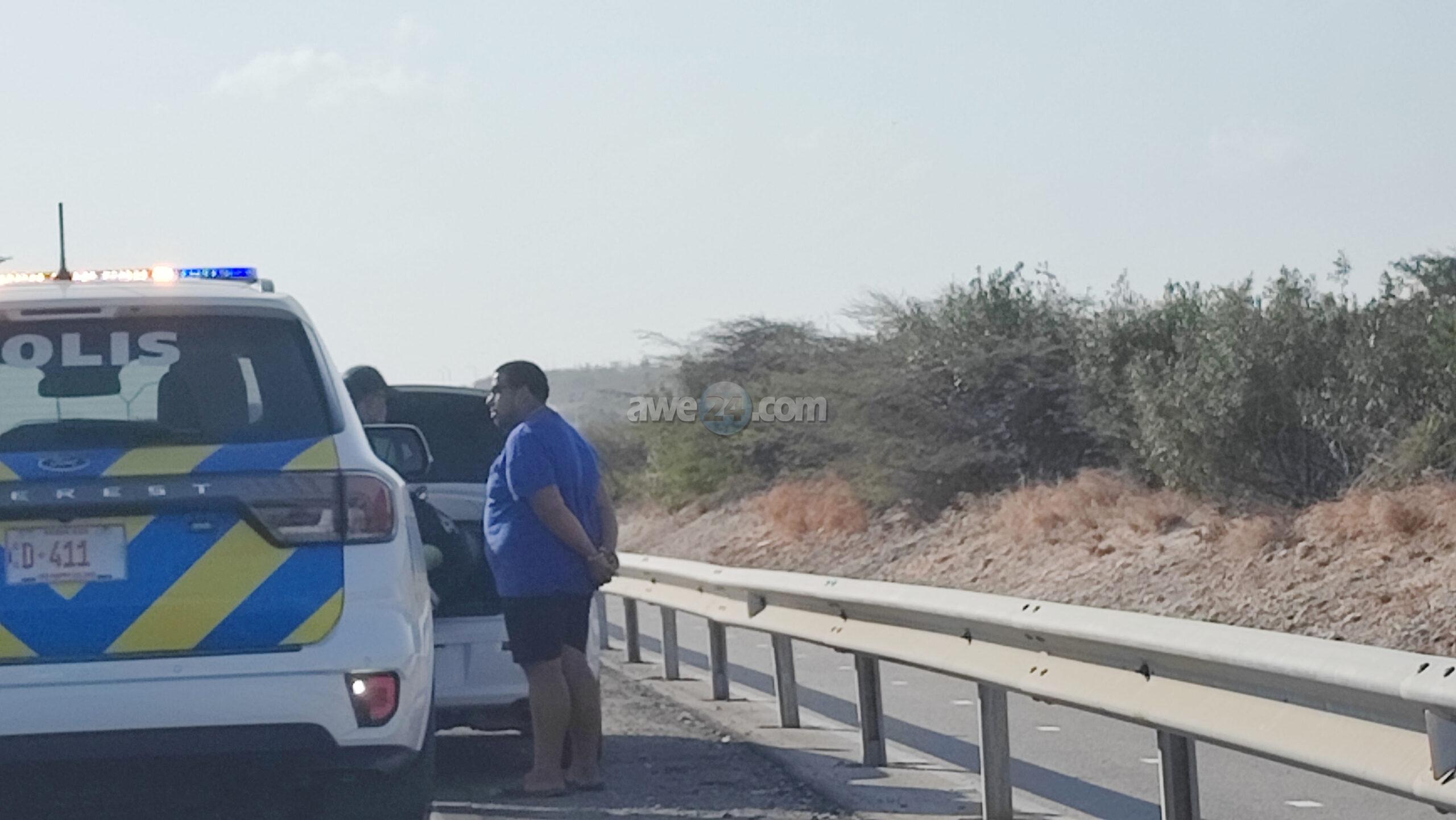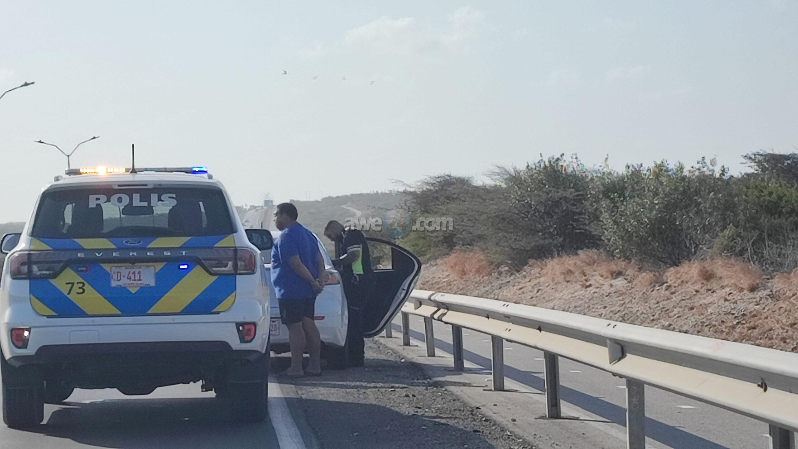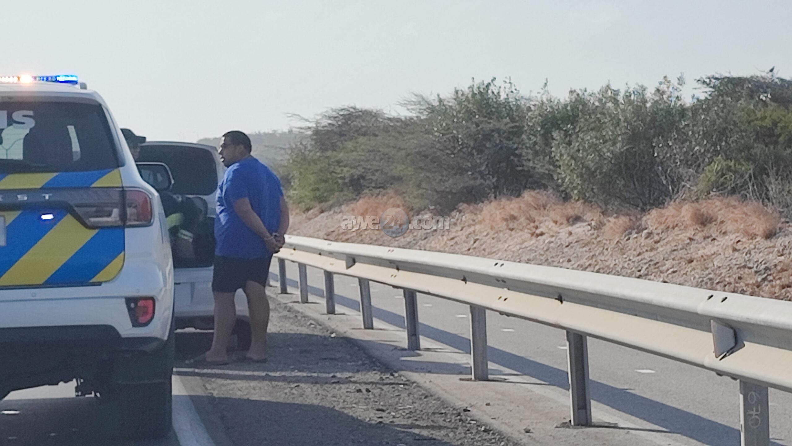 Diasabra atardi polis tabata en busca cu un Mitsubishi Lancer unda cu e homber tabata maltrata y choca e muher, polis a nota un otro mitsubishi Lance coriendo cu velocidad halto na altura di Pos Chikito y a bay su tras y a logra pare poco mas pabao di rotonde Balashi unda eynan a haya holor fuerte di marihuana y ora a listra den e auto a haya pakinan di droga. Eynan a detene y a confisca tur e droga.
