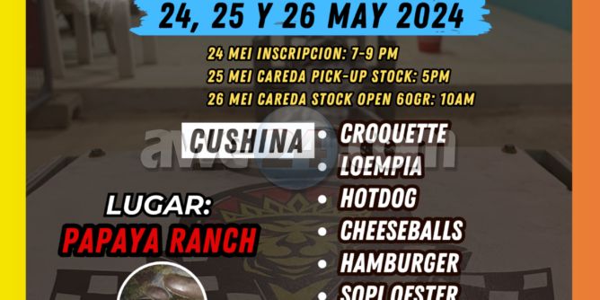 Diabierna 24 mei 2024 di 7or pa 9or anochi lo tin inscripcion y diasabra 25 mei 2024 pa 5or atardi caredanan di categoria Pick-up Stock lo start. Diadomingo 26 mei 2024 pa 10or mainta lo tin caredanan di categoria Stock Open 60 gram.