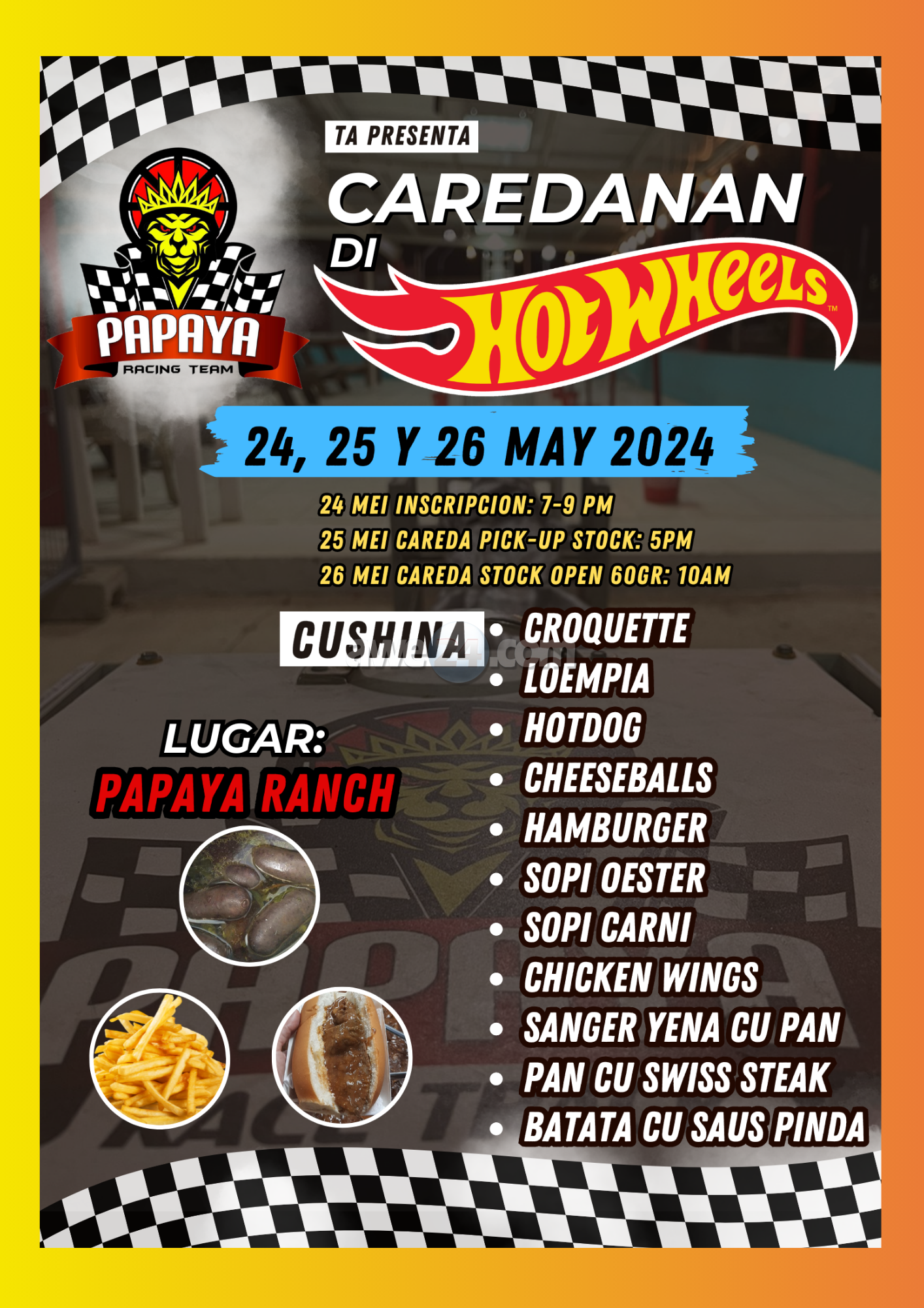 Papaya Racing ta invita un y tur pa asisti y apoya tur coredornan di Hot Wheels na Papaya Ranch y manera custumber lo tin bar y cushina bon surti.