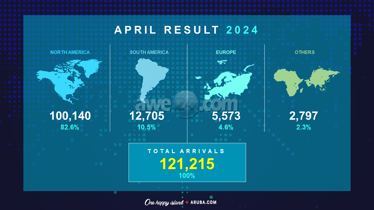 Den april 2024, 82.6% di e total di e bishitantenan “stayover” pa Aruba a bishita for di Norte America, 4.6% a bishita for di Europa, 10.5% a bishita for di Latino America y 2.3% tawata procedente di otro partinan di mundo.