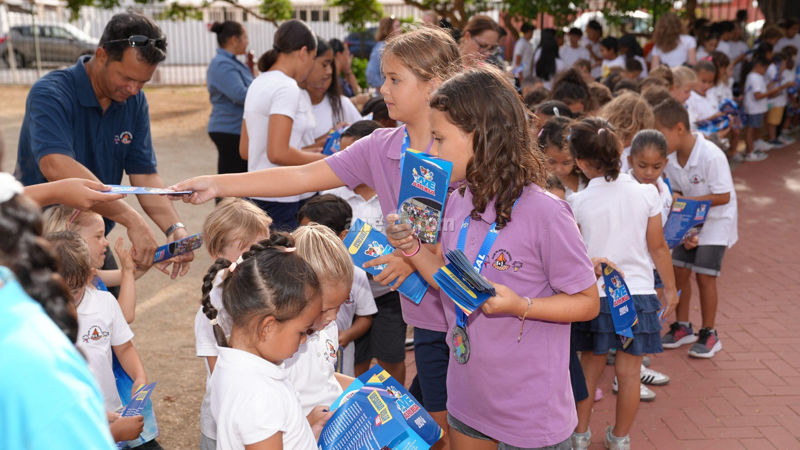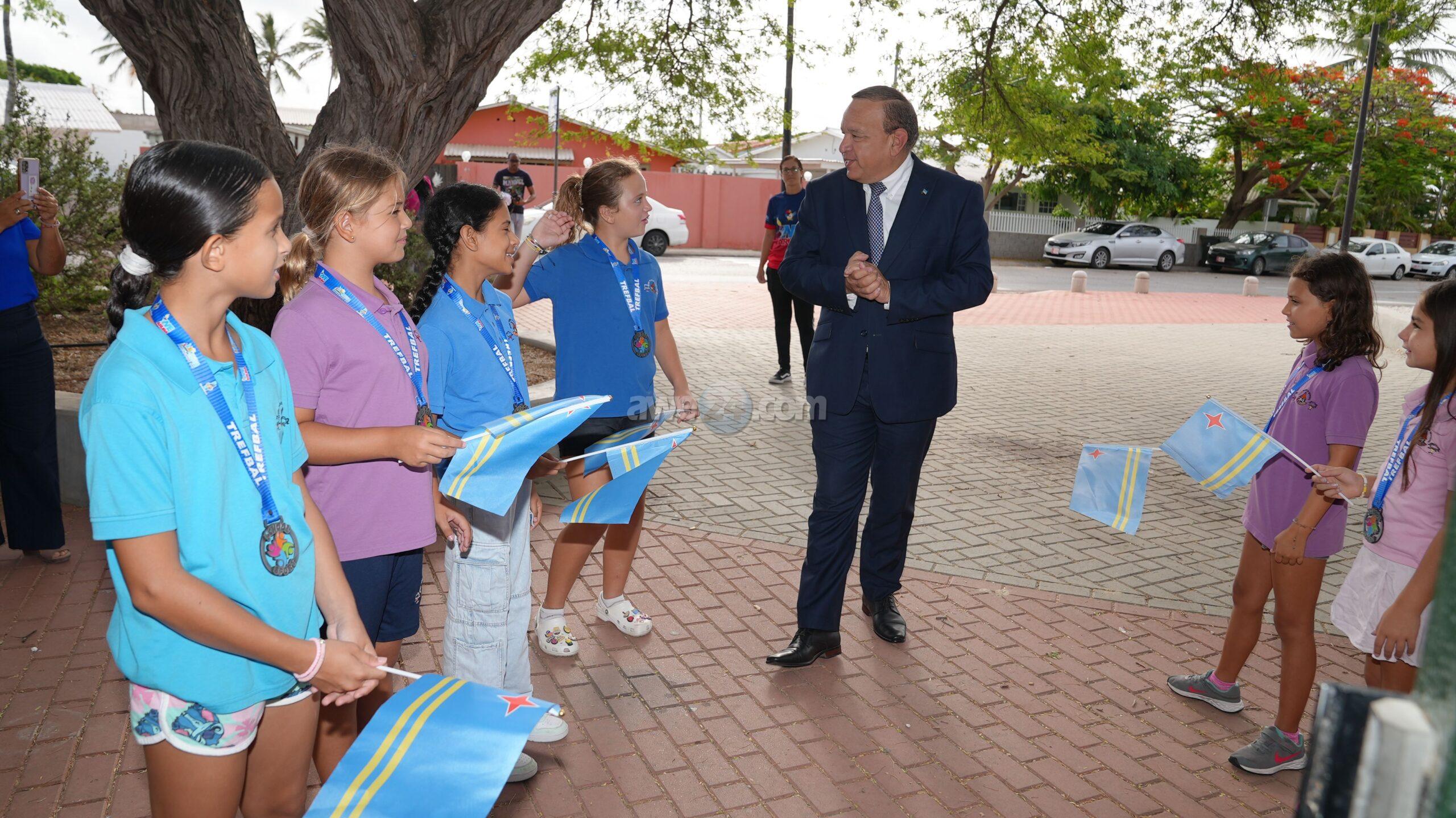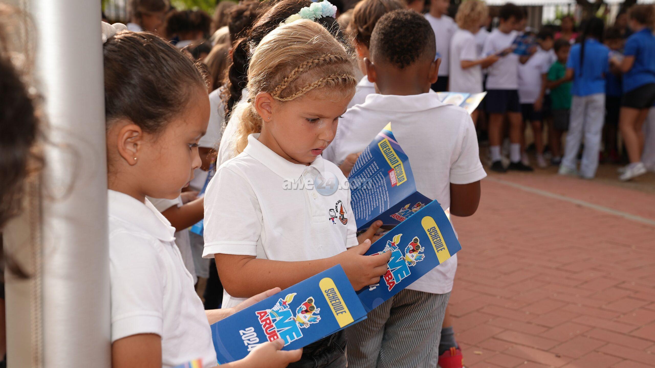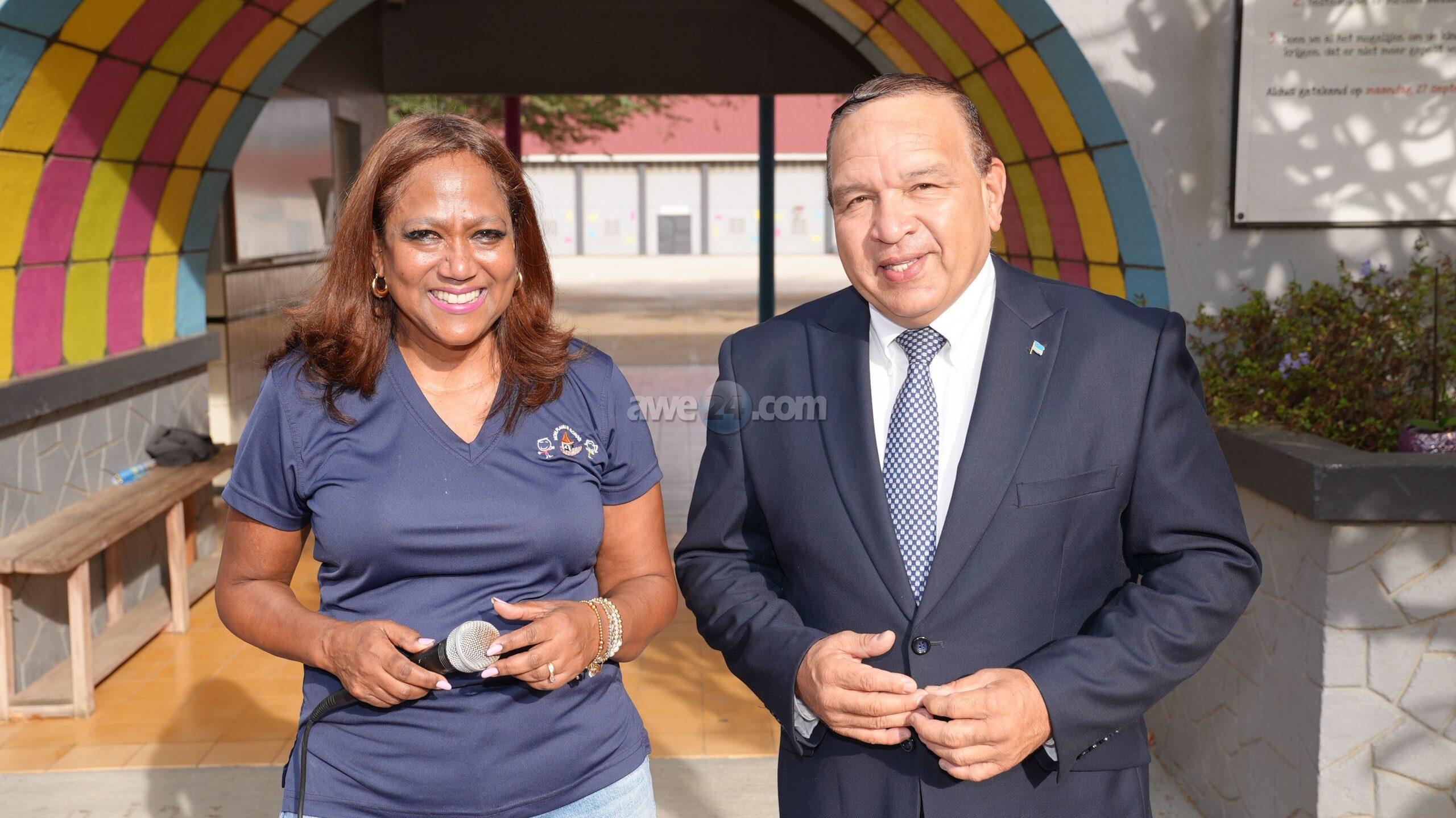 ORANJESTAD: Dialuna mainta, Minister Endy Croes huntocu mascota Wiwi a bishita scol preparatorio y basico di Mon Plaisir. Manera ta conoci, Weganan Escolar 2024 ta inicia dia1 di juni pa 15 di juni proximo. Weganan Escolar ta un competencia pa e alumnonan di scol preparatorio, basico y secundario cu ta competi den diferente disciplina e.o. futbol, volleyball, beach tennis, badminton, “kids athletics”, We Mente y We Baile. Pues dos siman di competencia, unda cu 1300 alumno di 45 scol lo bataya contra otro pa conkista e titulo maximo. A base di peticion di e mandatario di Deporte,tur scol cu ta participa na Weganan Escolar ta hisa bandera diAruba y bandera di Weganan Escolar riba dialuna. E meta diesaki ta pa inculca e amor patria den nos hobennan y crea e espirito di competencia. E mandatario di Deporte a presenciae ceremonia, unda cu a hisa e bandera y canta e himno diAruba y di Weganan Escolar. Por ultimo, Minister Endy Croesta gradici cabesante, maestro-, staf y alumno di Mon PlaisirSchool pa e caluroso recepcion y e bunita y exitoso mainta. Cu e deseo, disciplina, dedicacion y determinacion ta logra. Alabes, ta invita Pueblo di Aruba pa duna sosten y apoyo na nos muchanan durante e competencia di Weganan Escolar 2024.