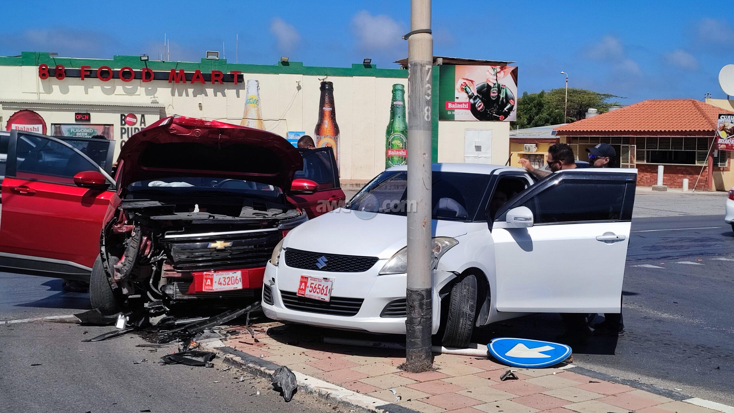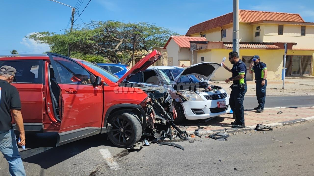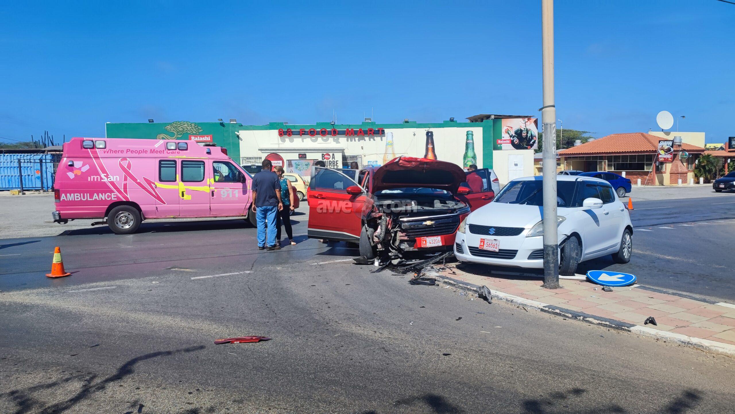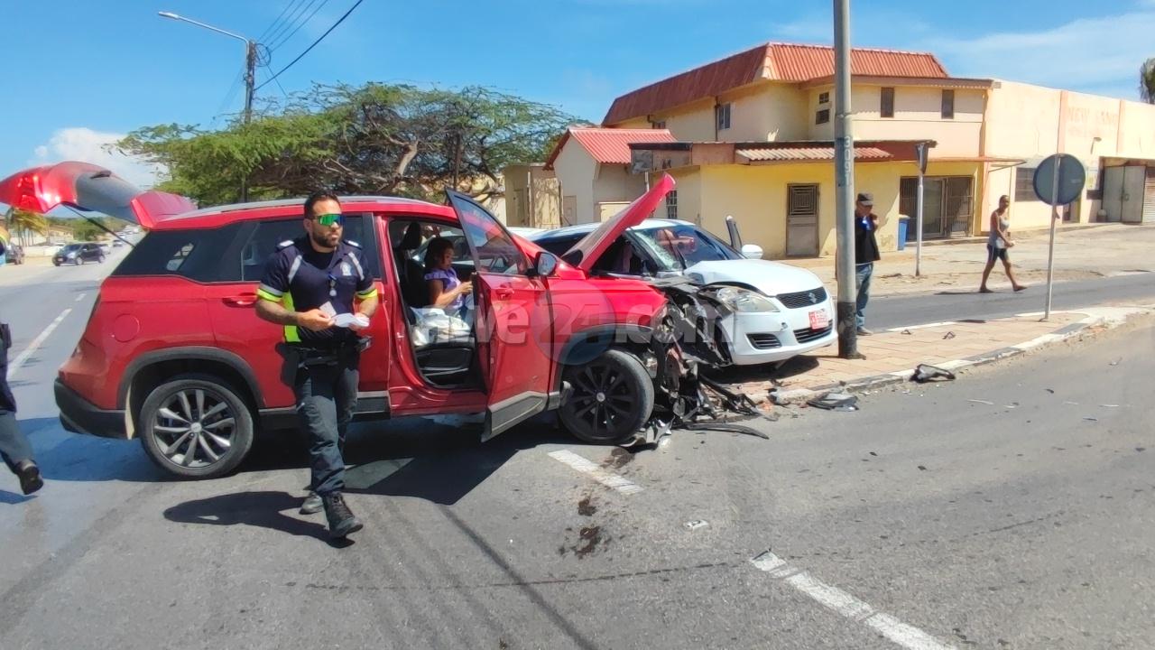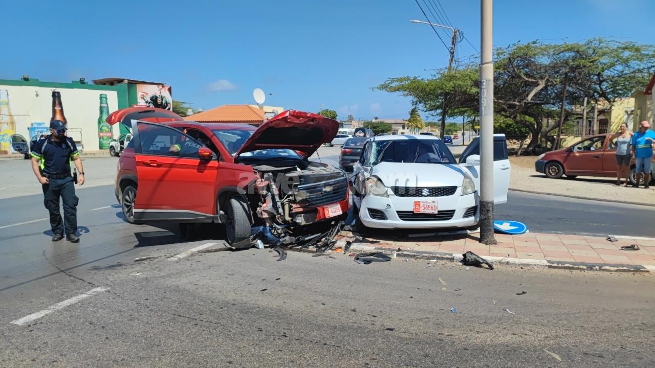 Diahuebs atardi a drenta informe di un accidente cu hende herida dilanti 88 Foodmart na Macuarima, mesora a dirigi tanto polis como ambulans na e sitio. Na yegada di e patruya a bin compronde cu aki ta trata di un accidente unda e chauffeur di e Suzuki blanco biniendo di zuid a bay bira na man robes pero no a duna preferencia na e trafico contrario y nan a dal basta duro contra otro. Debi na e fuerte impacto ambos chauffeur a resulta herida y tambe un mucha sinta patras den e auto contrario. Na yegada di e ambulans nan a atende e victimanan y a transporta nan pa hospital.