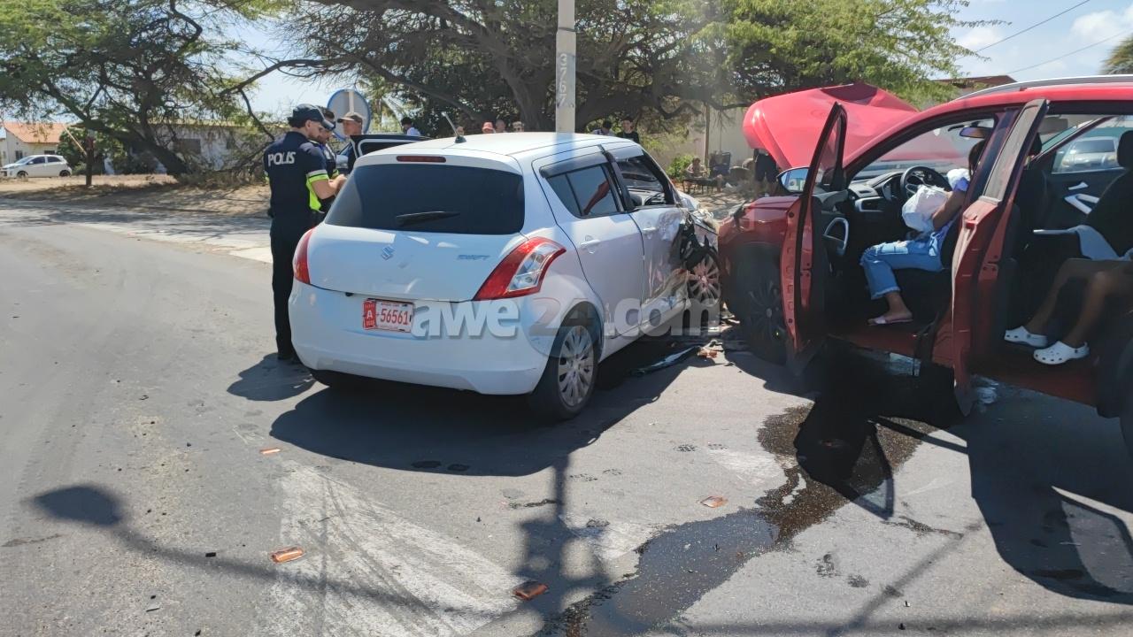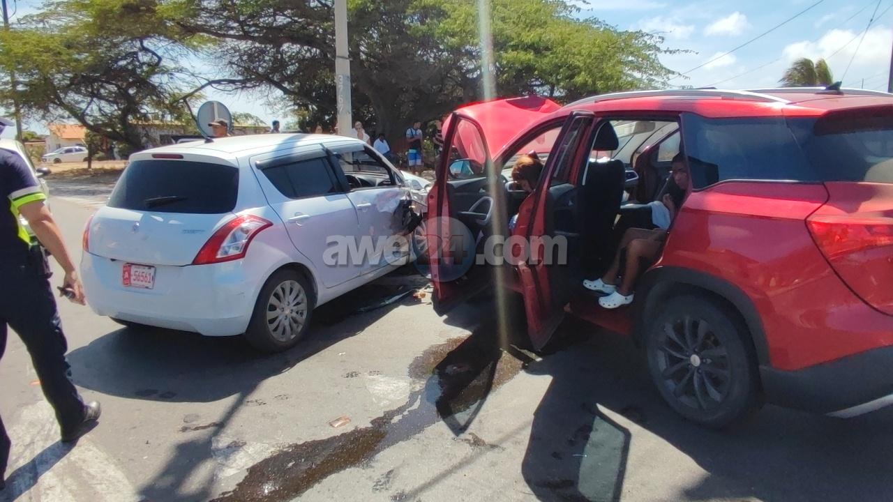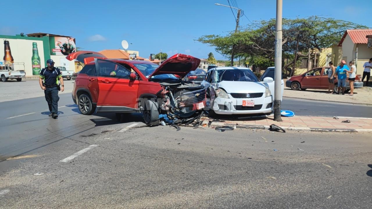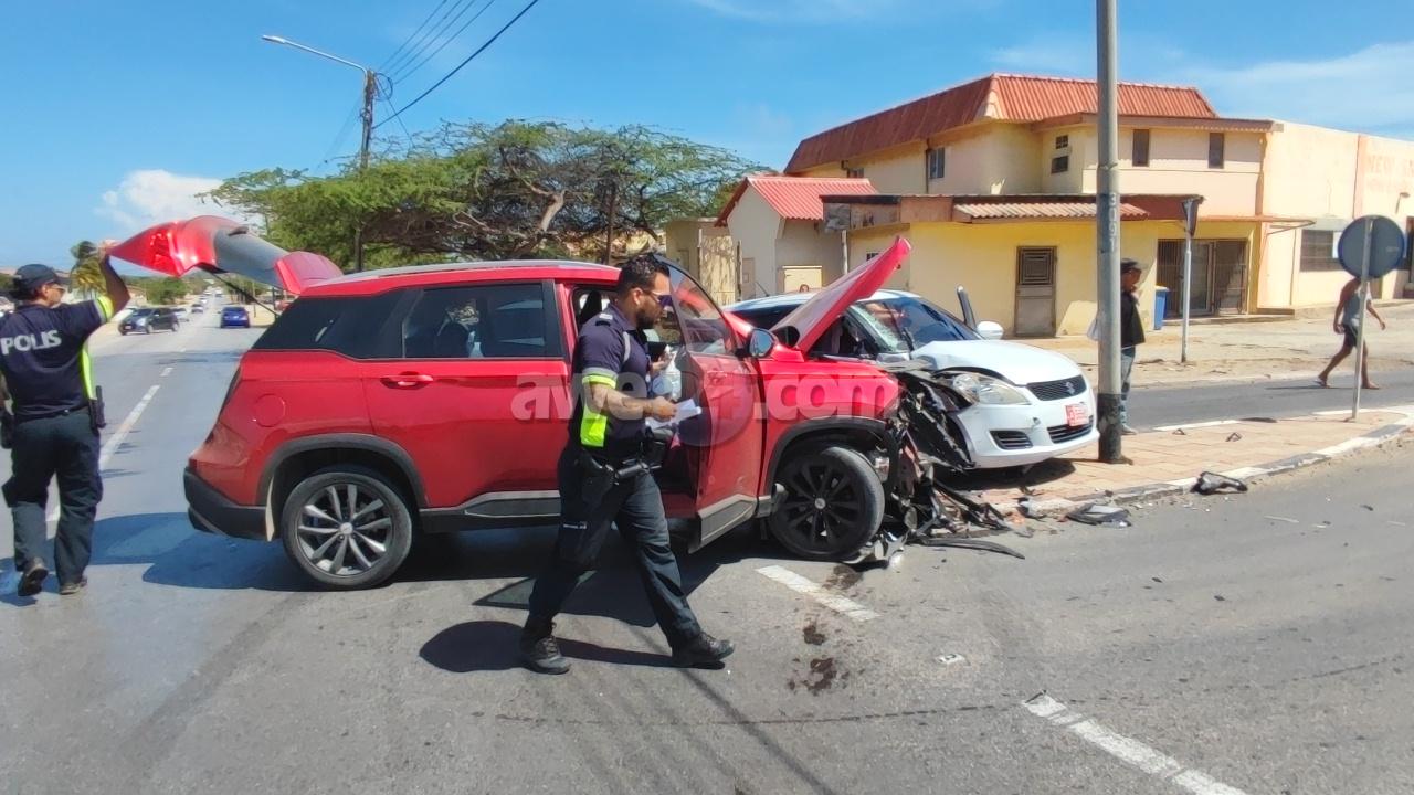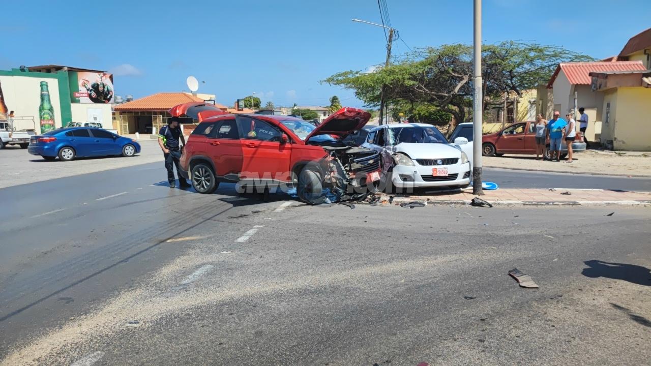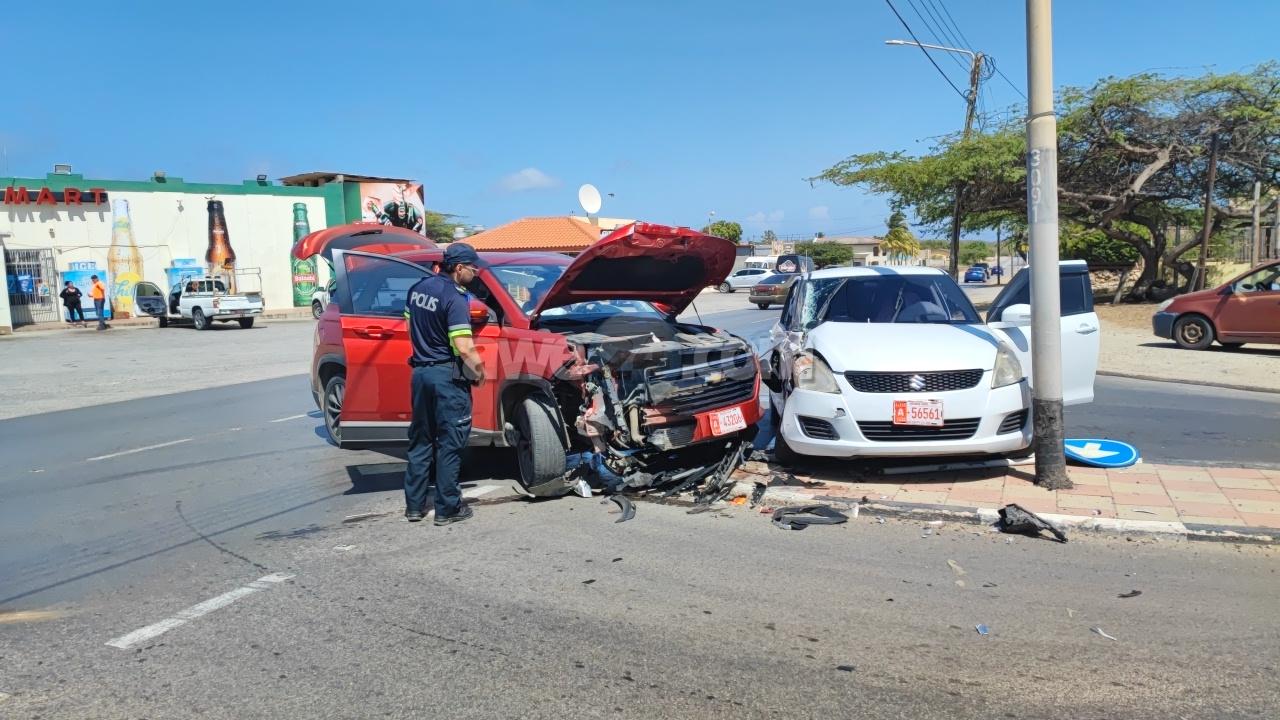Diahuebs atardi a drenta informe di un accidente cu hende herida dilanti 88 Foodmart na Macuarima, mesora a dirigi tanto polis como ambulans na e sitio. Na yegada di e patruya a bin compronde cu aki ta trata di un accidente unda e chauffeur di e Suzuki blanco biniendo di zuid a bay bira na man robes pero no a duna preferencia na e trafico contrario y nan a dal basta duro contra otro. Debi na e fuerte impacto ambos chauffeur a resulta herida y tambe un mucha sinta patras den e auto contrario. Na yegada di e ambulans nan a atende e victimanan y a transporta nan pa hospital.