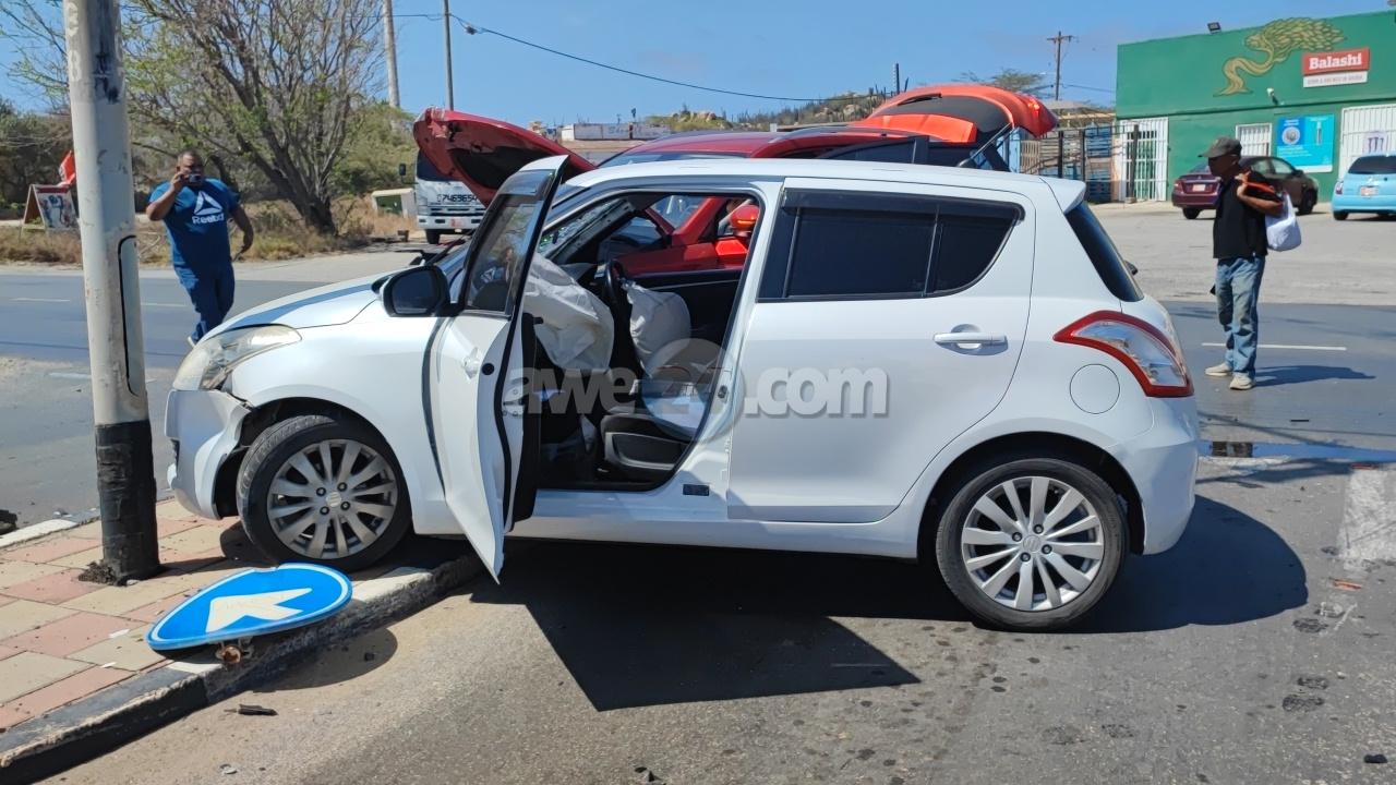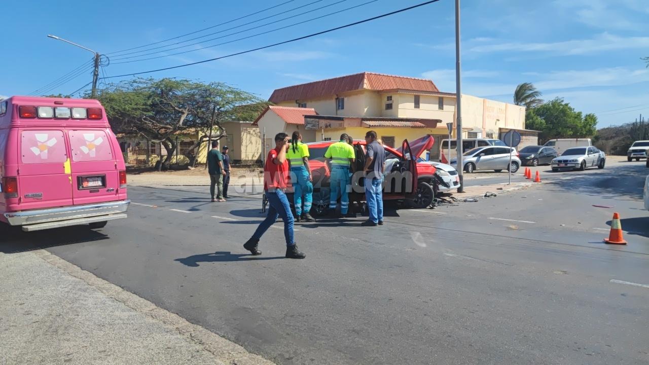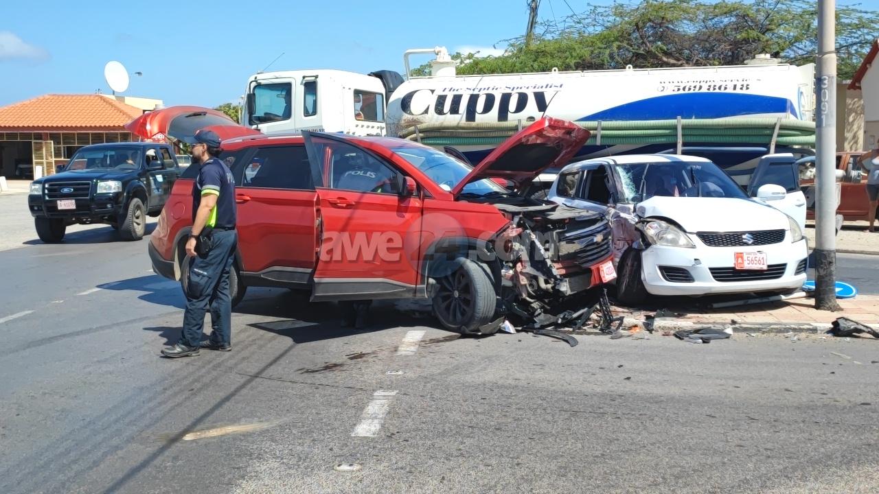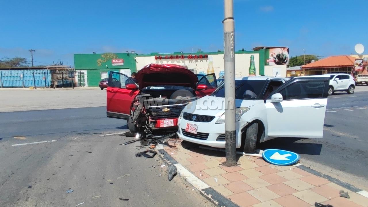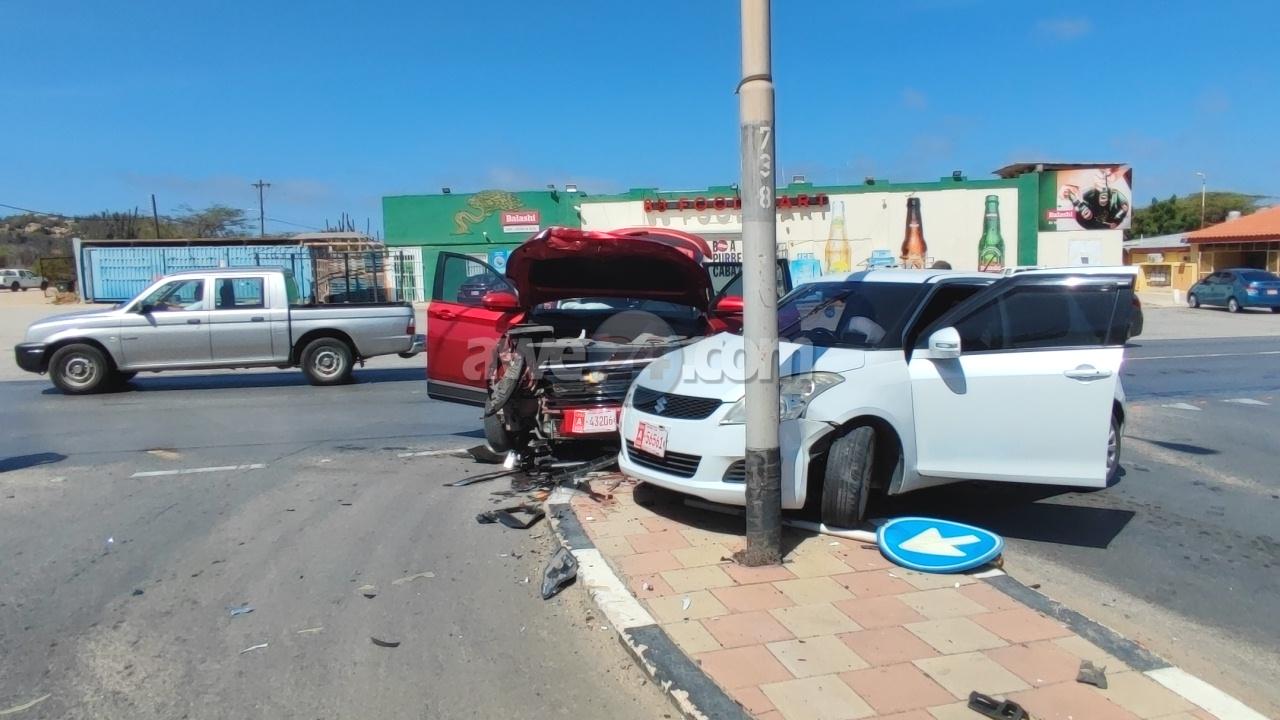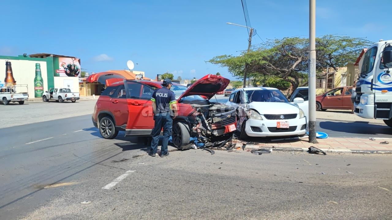 Diahuebs atardi a drenta informe di un accidente cu hende herida dilanti 88 Foodmart na Macuarima, mesora a dirigi tanto polis como ambulans na e sitio. Na yegada di e patruya a bin compronde cu aki ta trata di un accidente unda e chauffeur di e Suzuki blanco biniendo di zuid a bay bira na man robes pero no a duna preferencia na e trafico contrario y nan a dal basta duro contra otro. Debi na e fuerte impacto ambos chauffeur a resulta herida y tambe un mucha sinta patras den e auto contrario. Na yegada di e ambulans nan a atende e victimanan y a transporta nan pa hospital.