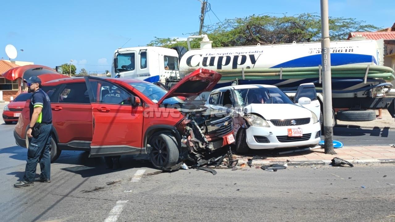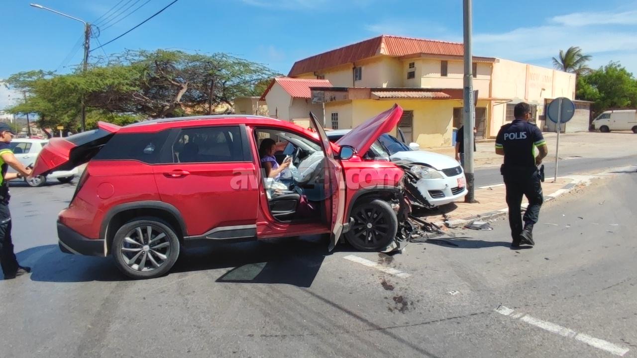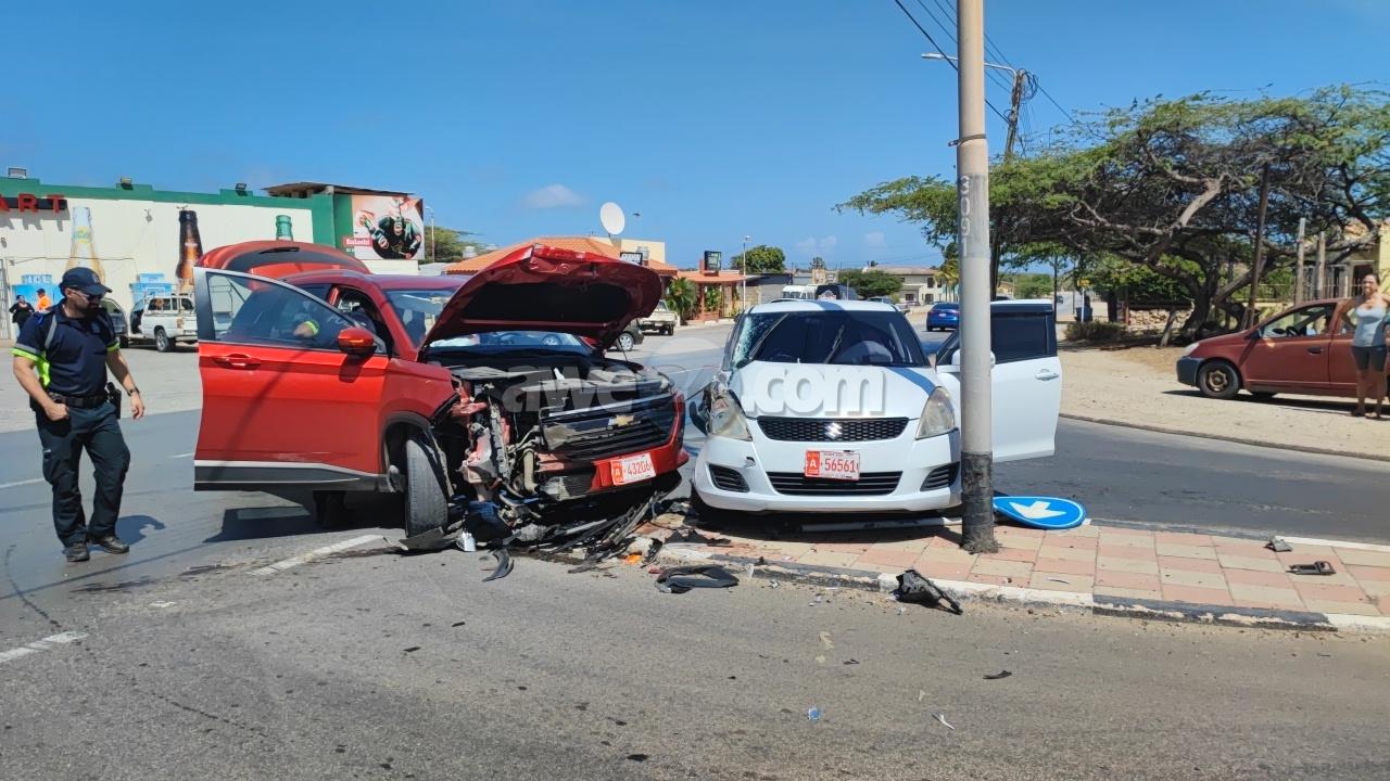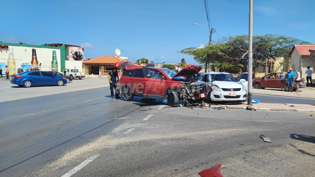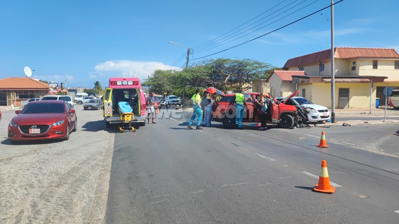 Diahuebs atardi a drenta informe di un accidente cu hende herida dilanti 88 Foodmart na Macuarima, mesora a dirigi tanto polis como ambulans na e sitio. Na yegada di e patruya a bin compronde cu aki ta trata di un accidente unda e chauffeur di e Suzuki blanco biniendo di zuid a bay bira na man robes pero no a duna preferencia na e trafico contrario y nan a dal basta duro contra otro. Debi na e fuerte impacto ambos chauffeur a resulta herida y tambe un mucha sinta patras den e auto contrario. Na yegada di e ambulans nan a atende e victimanan y a transporta nan pa hospital.