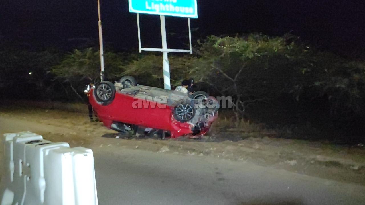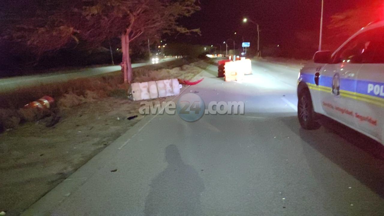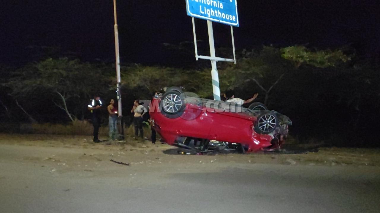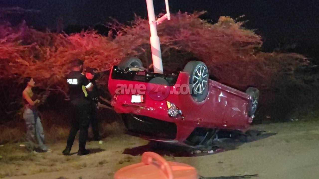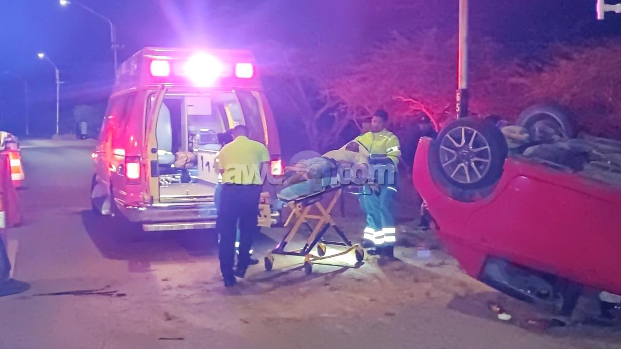 Den e ultimo minuutnan di dia di tata a drenta informe di un accidente cu hende herida riba Sasakiweg, mesora a dirigi tanto polis como ambulans na e sitio. Na yegada di e patruya a bin compronde cu aki ta trata di un accidente unda e dama chauffeur di un auto Toyota bayendo nort cu velocidad halto a perde control dal contra e baricadanan di plastic na Sasakiweg y bolter. Debi na esaki e 2 pasaheronan masculino a resulta herida y tabata keha di dolor. Na yegada di e ambulans nan a atende 2 di e victimanan y a transporta nan pa hospital. mientras cu e dama chauffeur y un otro pasahero femenino a sali ileso.