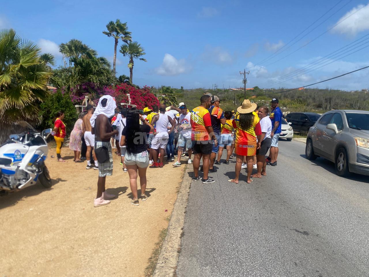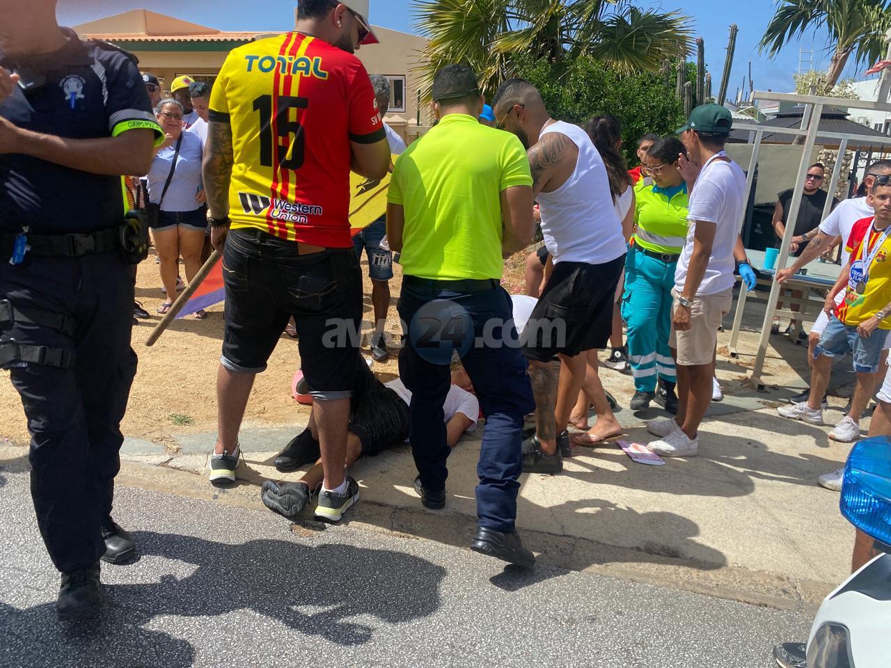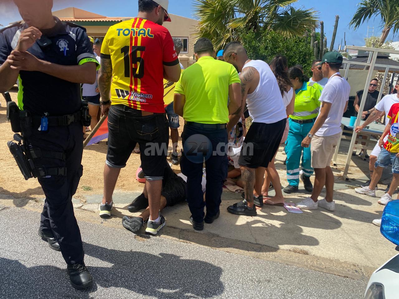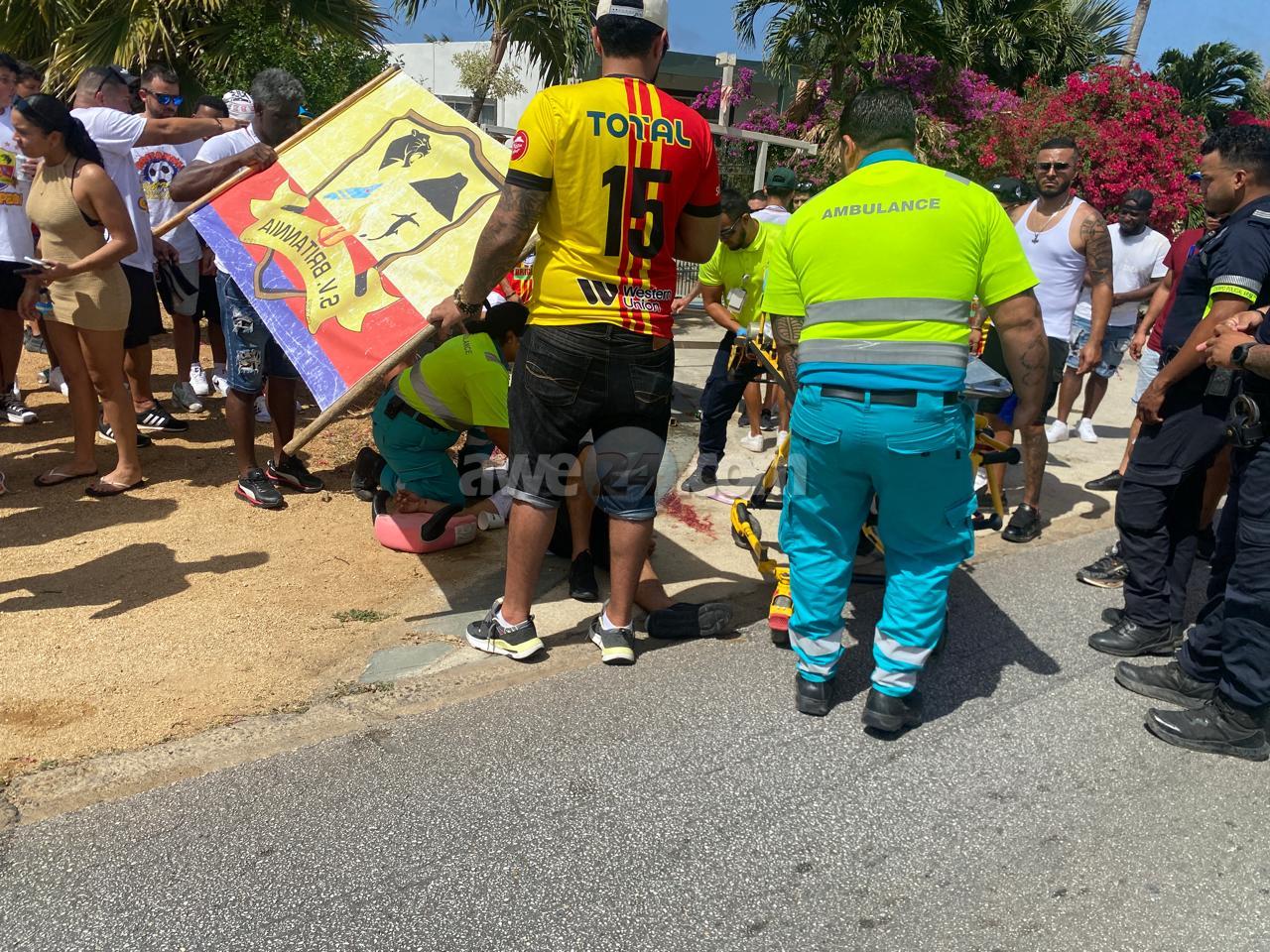 Diadomingo atardi e polisnan encarga cu guia e parada di triunfo di Britannia a informa di un incidente cu hende herida na Tamarijn unda un participante a cay for di un trailer y ta seriamente herida cu un kap grandi patras di su cabes y mester ambulans cu urgencia. Na yegada di e ambulans nan a atende e victima y a transporte cu urgencia pa hospital.