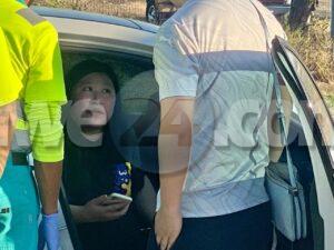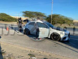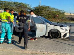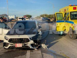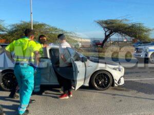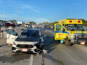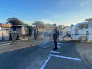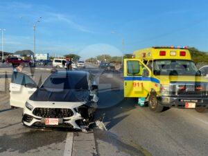 Diaranson atardi a drenta informe di un accidente cu basta daño y hende herida, mesora a dirigi tanto polis como ambulans na e sitio. Na yegada di e patruya a bin compronde cu aki ta trata di un accidente unda 3 auto ta envolvi. Segun por a compronde for di e testigonan cu ta un Mercedes biniendo pabao cu velocidad halto yegando e crusada a spanta purba brake pero a bay un poco dimas na banda robes di caminda y a dal semi frontal riba un Mazda di direccion contrario djey bay dal riba un Mitsubishi L300 para na e crusada pa subi rancando su bumper y a purba sigui bay pero a keda para un poco mas pabao. Den e Mercedes Benz tabata tin un dama di 28 aña pasahero cu ta na estado pa 8 luna y tabata keha di dolor. Na yegada di e ambulans nan a atende e dama y a transporte pa hospital. E dama chauffeur di e Mazda tambe a cuminsa haya dolor. Na yegada di un otro ambulans nan a atende e victima na e sitio mes.