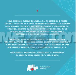 COMO OFICINA DI TURISMO DI ARUBA, A.T.A. TA GRADICI PA E TRABOU ADICIONAL COLECTIVO CU Y ENTRE ORGANISMO GUBERNAMENTAL Y SOCIONAN LOCAL DURANTE E ULTIMO 72 ORA. NOS TA RECONOCE E COMPLICIDAD DI E SITUACION. MIENTRAS CU TA SPERA CU TUR PARTIDO POR YEGA NA UN ACUERDO MUTUO MAS PRONTO CU TA POSIBEL, MESTER TENE E