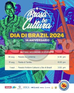 ORANJESTAD – Departamento di Cultura Aruba ta invitacomunidad di Aruba pa ban celebra Dia di Brazil. Diabierna: Parada cu Lanterna – Diasabra: Fiesta di Tambu – DiadomingoFeria di Cuminda y Parada Folklore Cultural. Despues di variosexitoso evento cultural cu a tuma luga e ultimo simannan, manera ‘Cantica di Caya’, ‘Show y Coronacion ReinananCultural 2024’, e fin di siman aki lo ta e culminacion pa celebraDia di Brazil. Esaki lo ta e di 14 aña cu ta celebra Dia di Brazil, cu nos musica crioyo, nos cuminda local, nos trahenantradicional y nos cultura Arubano den un dushi ambiente den cayanan di Brazil.