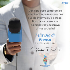 Awe, riba dia di prensa mi kier extende mi mas sincero felicitacion na tur periodista-, reportero-, editor-, fotografo y demas profesionalnan cu ta forma parti di e balioso gremio di e comunicacion.