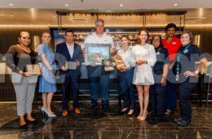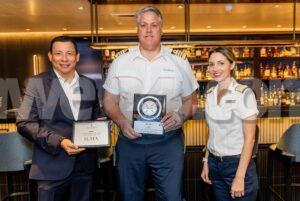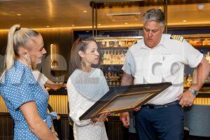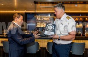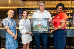 Den representacioon di Aruba entre otro, Ronella Croes, CEO di Aruba Tourism Authority, y Marc Figaroa, CEO di Aruba Ports Authority, a presenta un plakaat conmemorativo na e capitan di Ilma, Darin Bowland, cu a expresa su gratitud pa e ricibimento caluroso di nos localnan.