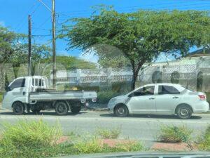 Chauffeur di un Toyota Yaris no a regula su velocidad ni a mantene distancia a bay dal tras di un pick-up na Paradera