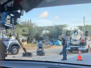 Diamars atardi habitantenan di Paraguana a tende un desordo pafo y diripiente coriente a bay, mesora a pensa riba auto a dal un palo di lus. Ora nan a sali pafo a mira un auto kibra core bay for di e sitio. Nan a coy e number y modelo cu color di e auto y a avisa polis ya cu esaki ta un accidente “hit & run” cual lo sal e chauffeur basta placa pa paga! E personal di ELMARNV a traha mesora y duro pa asina keda cla liher cu e trabaonan di cambia palo di lus.