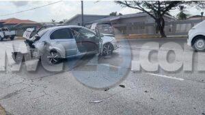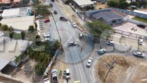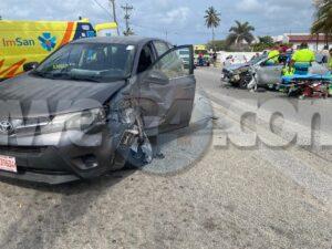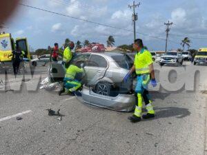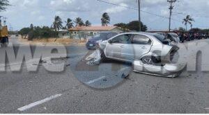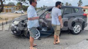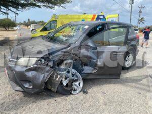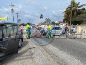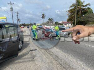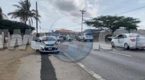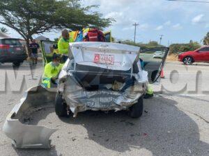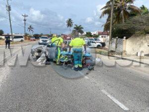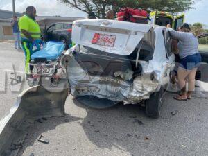 Diahuebs mainta a drenta informe di un accidente cu hende herida dilanti Anytime Bar & Restaurant na Paradera, mesora a dirigi tanto polis como ambulans na e sitio. Na yegada di e prome patruya a bin compronde cu aki ta trata di un accidente unda un Chevrolet Aveo biniendo for di e rotonde Paradera y a bay pa bira bay Rooi Afo dilanti Anytime mientras su tras tabata bini un Kia Picanto cu velocidad y sin brake a bay dal fuertemente tras di e Aveo mand’e banda robes dal un Toyota Rav4 den banda di e wiel causando un daño basta grandi na e Rav4 den cual tabata tin un dama na estado sinta na banda. Den e Aveo mes tabata tin un dama na stuur cual tambe a resulta herida pa cual na yegada di e ambulans a pidi un ambulans mas na e sitio. E dama chauffeur di e Kia Picanto mes tabata keha di un poco dolor nada mas pero no tabata tin mester di ambulans.