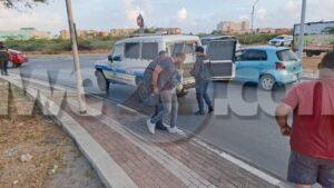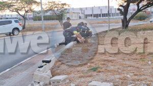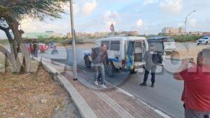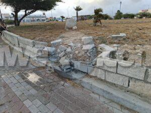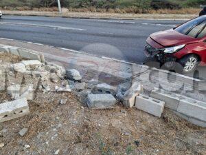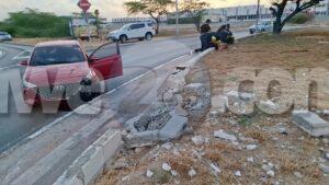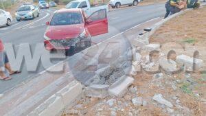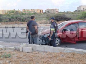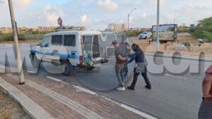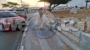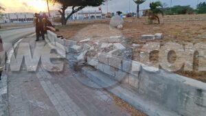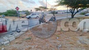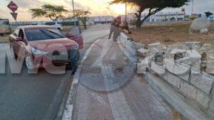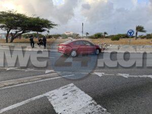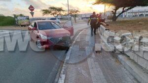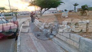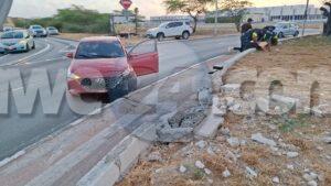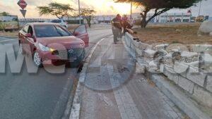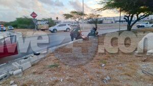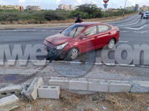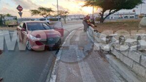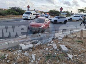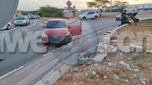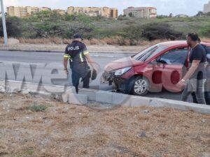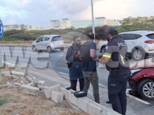 Diadomingo mainta mientras cu polis tabata atendiendo e accidente banda di Superfood un auto bayendo nort a bisa polis di un otro accidente similar pero no tin hende herida. Mesora a dirigi un di e patruyanan na e accidente pa bay na e otro accidente na rotonde Sasaki. Na yegada di e patruya a bin compronde cu un chauffeur burachi a bay dal riba e muraya di e rotonde den reparacion y blokinan a spart, polis a constata cu e chauffeur ta burachi y a detene na momento di su detencion ela resisti y un dama a bay stroba trabao di polis tambe a ser deteni. Afortunadamente ningun hende a resulta herida.