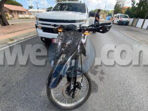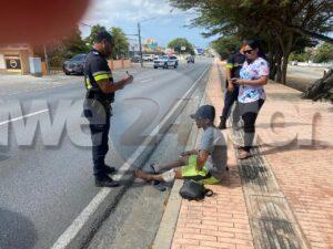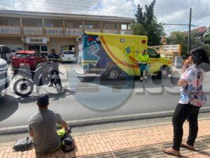 Diaranson mainta a drenta informe di un accidente cu hende herida na Caya Ernesto O. Petronia, mesora a dirigi tanto polis como ambulans na e sitio. Na yegada di e patruya a bin compronde cu un motociclista bayendo direccion di Oranjestad a kere cu tin un fila largo y a bay pasa un pick-up Chevrolet grandi pero dilanti di esaki un Mazda CX3 tabata wardando pa bira bay para den un parkinglot pero diripiente e motociclista a purba evita dal den e Mazda pero e impacto tabata inevitable y a bay dal tras di esaki. Debi na e impacto e motociclista a resulta herida. Na yegada di e ambulans nan a atende e victima y a transporte pa hospital. E motorcycle ta uno cu ela cumpra siman pasa y manera e foto ta indica e tin apenas 14 Kilometer so cori.