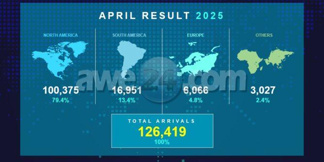 Den april 2025, 79% di e total di e huespednan “stayover” pa Aruba a bishita for di Norte America, 4.8% a bishita for di Europa, 13% a bishita for di Latino America y 2.4% tawata procedente di otro partinan di mundo.