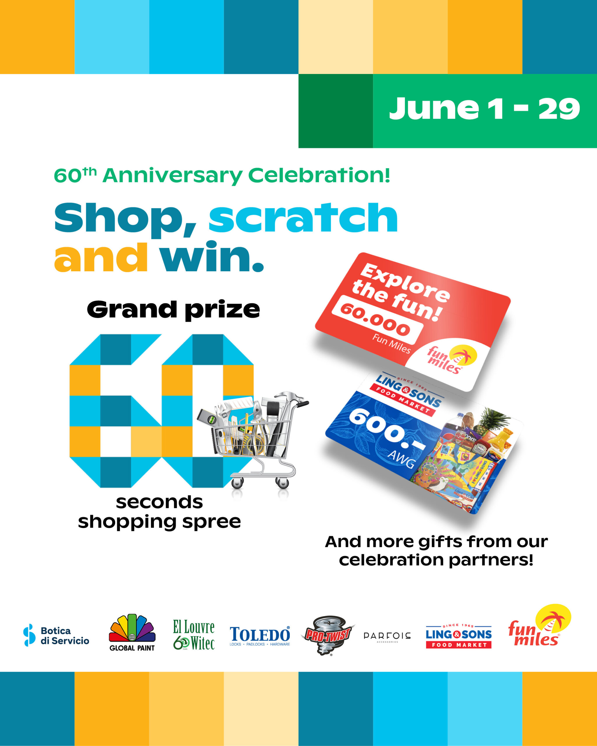 Kooyman Aruba ta celebra 60 aña y pa e ocasion aki, Kooyman a lansa un campaña di “Scratch & Win” cu hopi premio pa su clientenan. E campaña ta tuma lugar for di 1 te cu 29 di juni 2025.