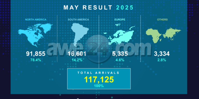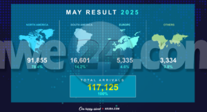 Den mei 2025, Aruba a ricibi un total di 117,125 turista “stayover”, representando un crecemento di 5.3% of 5,945 bishitante adicional compara cu mei 2024. E crecemento ta notabel den mercado Latino Americano, particularmente for di Argentina cu un aumento di 155.6%, Brasil cu 51.8% y Peru cu 21.4%. For di Norte America, a registra un aumento di 3.0%. Canada tin un crecemento di 41.3%.