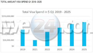 Den e promer kwartaal di 2025, 296,601 VISA cardholder di 134 pais cu a gasta mas di USD$201+ miyon na Aruba, representando un aumento di 8.8% den total di benta compara cu promer kwartaal di 2024. E aumento aki ta representa un subida di 7% den cantidad di cardholder y un crecemento di 10.4% den volumen di transaccion, mientras cu retiro di cash a yega US$17 miyon. Gasto pa cada cardholder a crece cu 1.9% compara cu mesun temporada 2024. Restaurants y Dining ta keda como e categoria principal den gasto cu US$58 miyon y un aumento di 11.2%. E siguiente categoria ta Hotels & Lodging cu US$49.6 miyon y un aumento di 12.8% cu ta exclui e pago pre-paid promer cu a yega Aruba. Na tercer luga ta Retail cu US$43.3 miyon y un aumento di 2.5%.