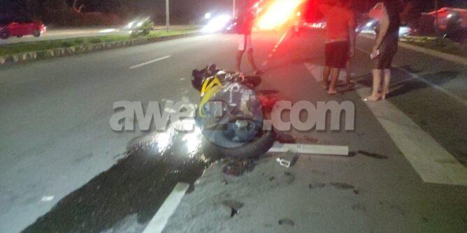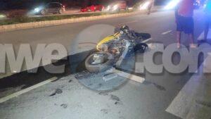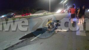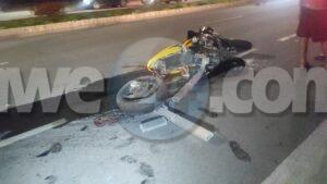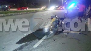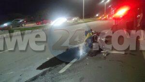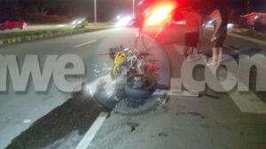 Diaranson anochi a drenta informe di un accidente cu hende herida riba E.J.”Watty” Vos Blvd., mesora a dirigi tanto polis como ambulans na e sitio. E ambulans cu tabata regresando su post na Wayaca tabata e prome pa yega na e sitio y a lanta e motociclista seriamente herida y pone den ambulans atende y transporte mesora pa hospital. Na yegada di e patruya ya caba e ambulans tabata den direccion di hospital. Investigacion pre-eliminar a indica cu e motociclista a bay subi e caminda net ora cu 2 auto tabata bini y e prome a haya e impacto cu e motorcycle a dal den dje den banda y esaki a pone e motocycle bolter y cay, e motociclista a cay riba caminda y e segundo auto lo a pasa riba dje fracturando su man y pia. Pa haci e investigacion polis a sera e caminda.