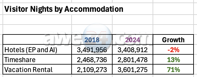 Loke si tin transparencia ta datos di turista cu ta yega Aruba y nan escohencia di alohamento. Analisando A.T.A. su datos di aña 2018 y compar’e cu ful aña 2024, por conclui cu e cantidad di estadia (visitor nights) no a crece den e sector di hotel. Aunque tin mas camber e no a causa cu tin mas alohamento na hotel; y esey kiermen cu hotelnan ta keda comparti e mesun cantidad di alohamento. Mientrastanto, estadia na Short Term Vacation Rental (STVR) a crece cu 71%. E realidad ta cu e crecemento grandi den nos volumen di turismo a tuma lugar den e segmento di turista cu ta skohe pa keda den un cas of apartamento.