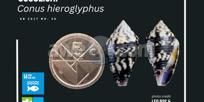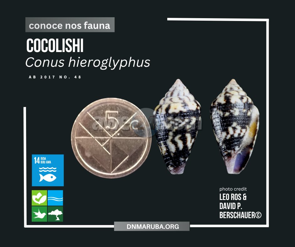 ORANJESTAD – E cocolishi Conus hieroglyphus, ta un molusco gastropodo marino di e famia Conidae ta un di e tres cocolishi endemico di Aruba. E nomber cu investigadonan local ta uza ta Arubaconus hieroglyphus pero e nomber aki no a haya aceptacion na nivel internacional ainda. Cu otro palabra, ta na Aruba so ta haya e especie aki. E area na unda a haya nan ta na Arashi den awa di lama no mas hundo cu 4 of 6 meter. Nan habitat ta den santo blanco grof den cercania di baranca, coral morto of rifnan di coral. E casca di e cocolishi ta den forma spiral cu ta caba den un punta roos y ta sinti grof cu rijnan di liña. E color ta mustra manera manchanan preto, maron cu blanco. E adultonan por crece te cu 21 milimeter. E cocolishi aki tin un bestia bibo paden di e casca cu por yam’e un ‘slak’.