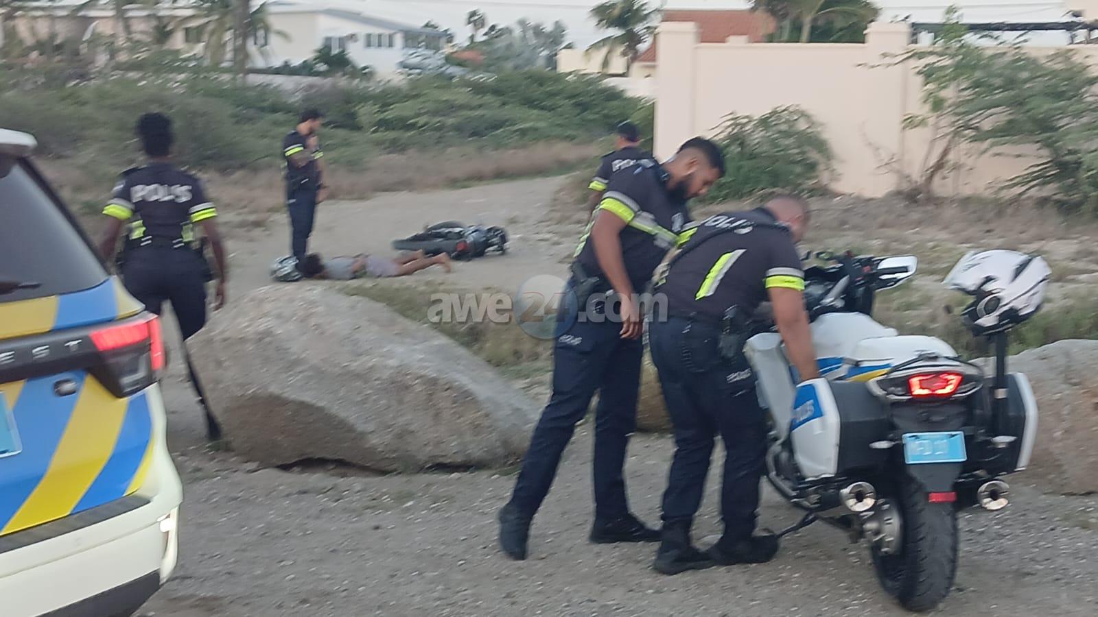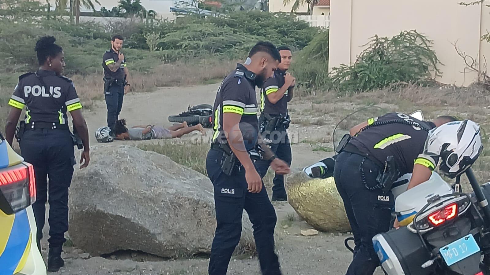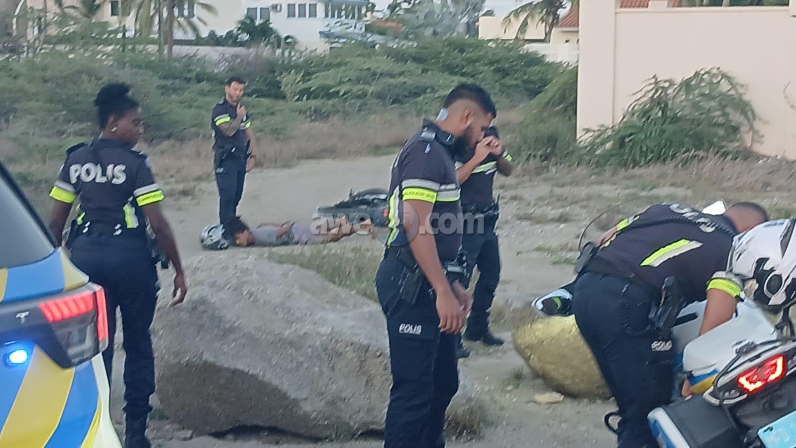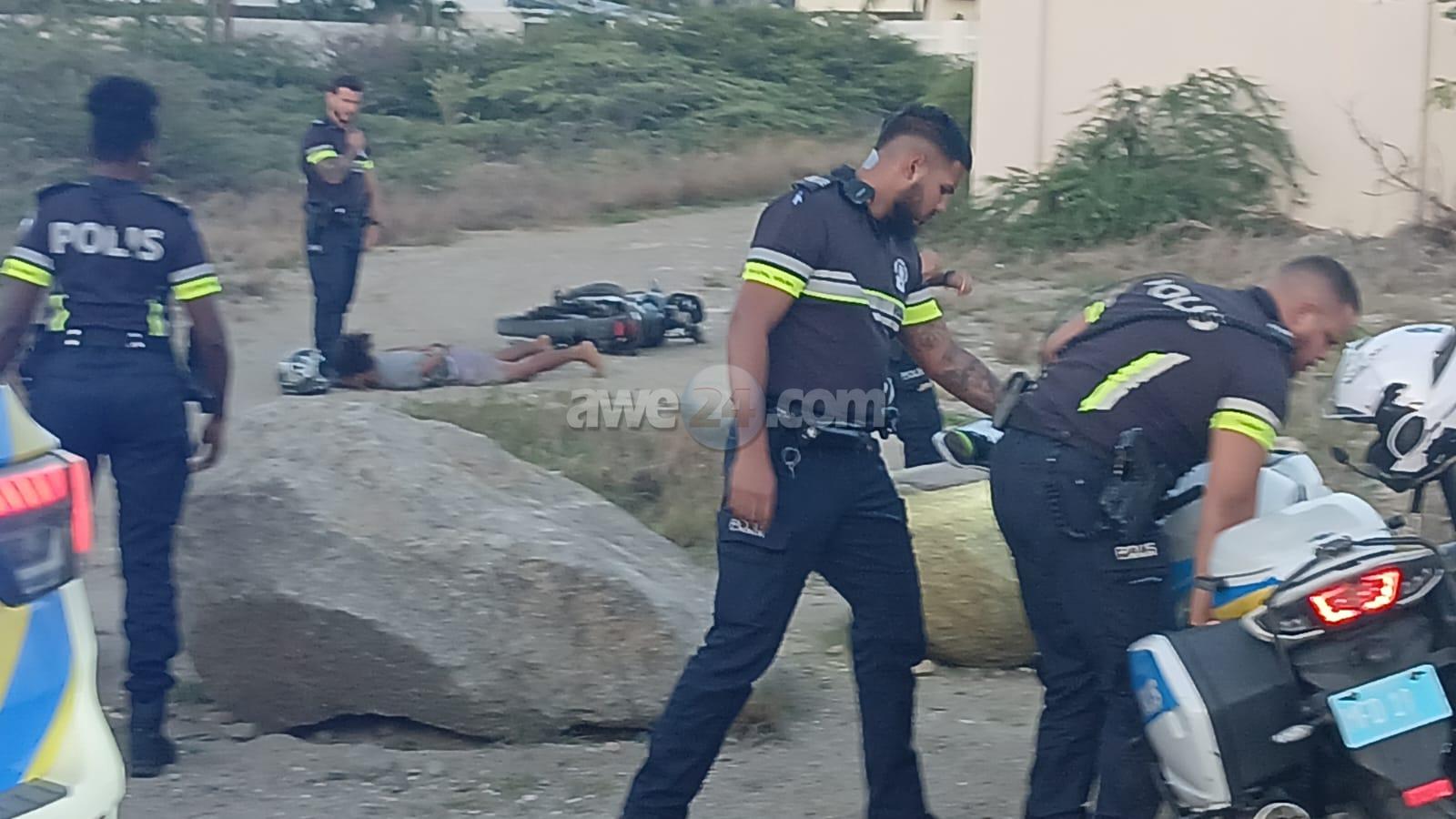 Diamars atardi a drenta informe di cu un polis di e brigada motorisa kier a para un motociclista den area di nort pero no kier a para. E motociclista a purba na un “shortcut” pero esaki a salie di malo y ela dal abao e polis cu tabata su tras tambe a dal abo pero mesora a lanta bay riba e sospechoso y a detene mientras refuerso a yega. E vehiculo di transporte tambe a presenta y a hiba e sospechoso hunto cu su brommer pa warda di polis.