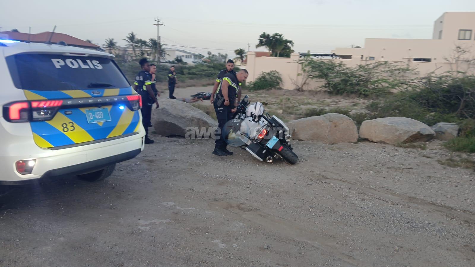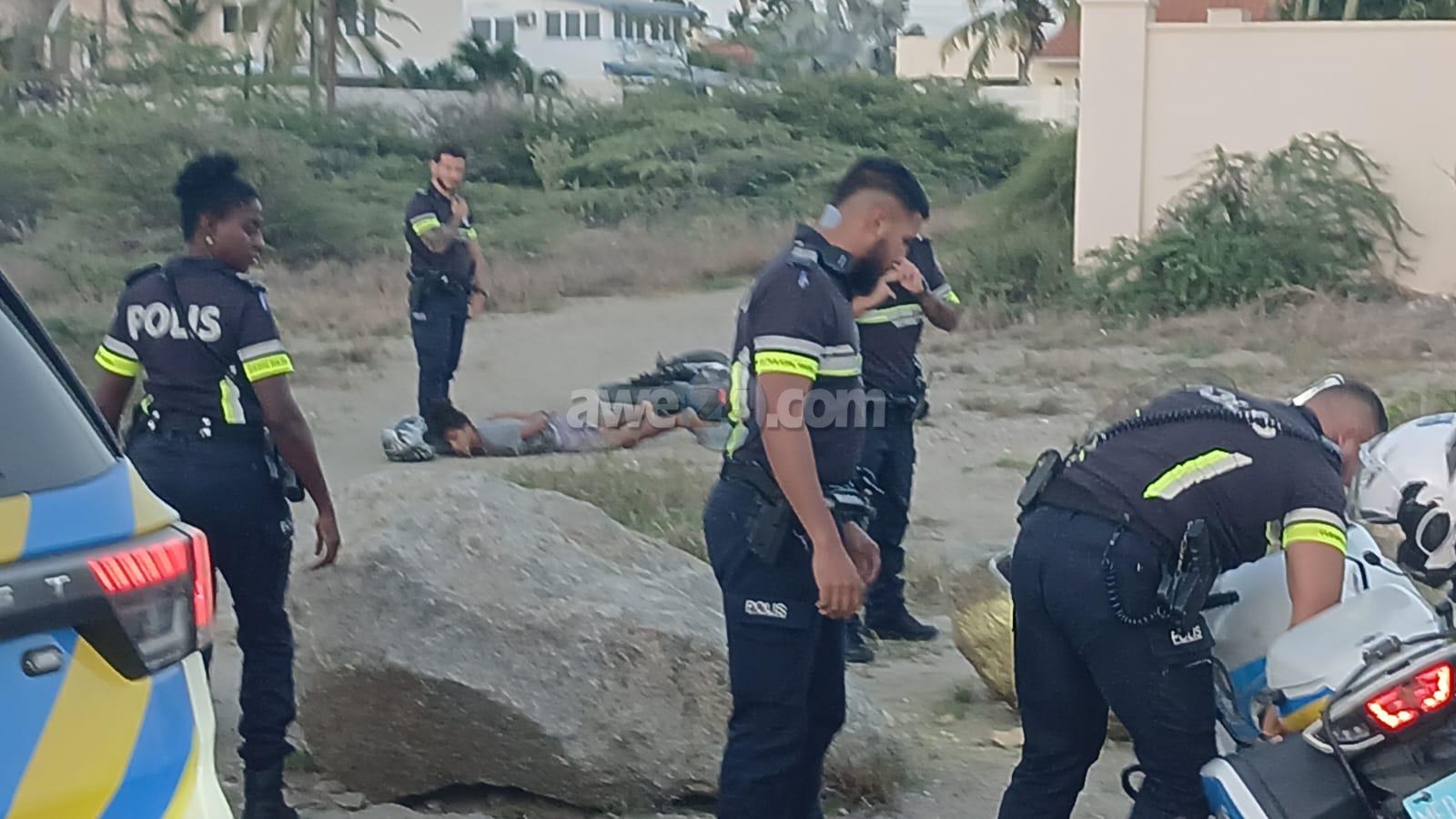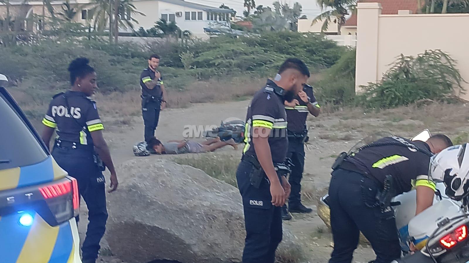 Diamars atardi a drenta informe di cu un polis di e brigada motorisa kier a para un motociclista den area di nort pero no kier a para. E motociclista a purba na un “shortcut” pero esaki a salie di malo y ela dal abao e polis cu tabata su tras tambe a dal abo pero mesora a lanta bay riba e sospechoso y a detene mientras refuerso a yega. E vehiculo di transporte tambe a presenta y a hiba e sospechoso hunto cu su brommer pa warda di polis.